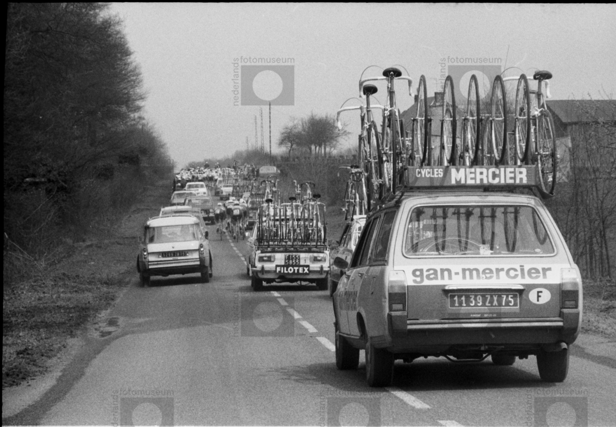 Peugeot 504 station met racefietsen Parijs-Roubiax, ...