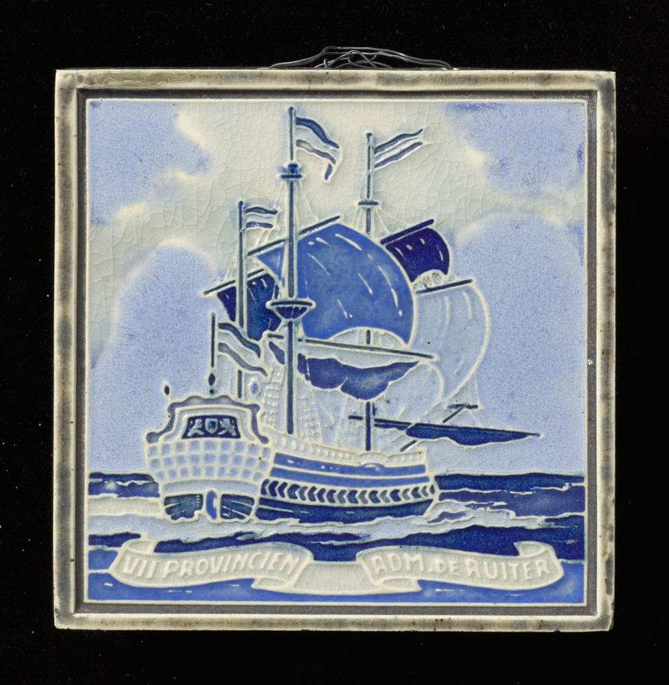 Tegel in cloisonné-techniek, met voorstelling: Schip...