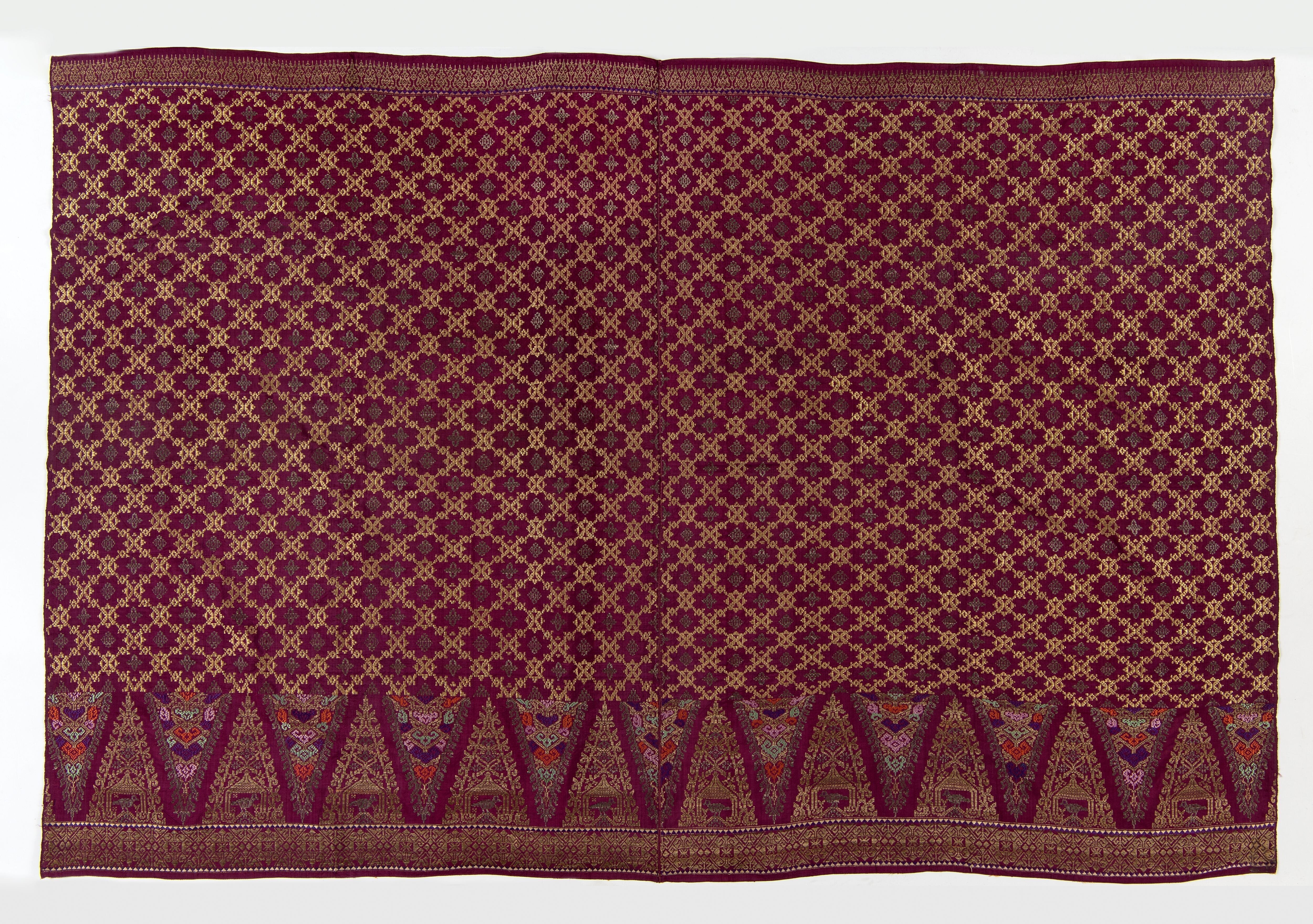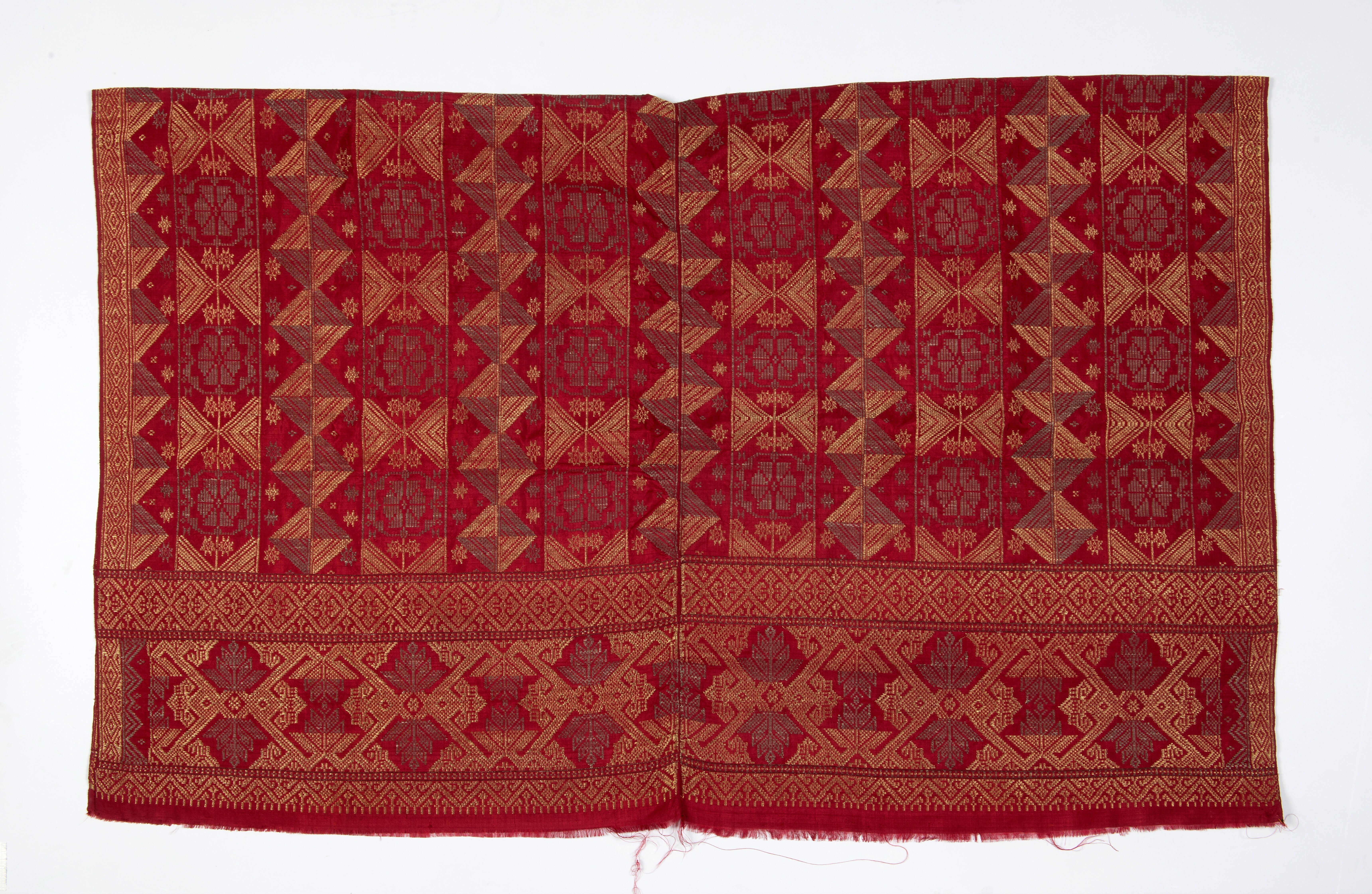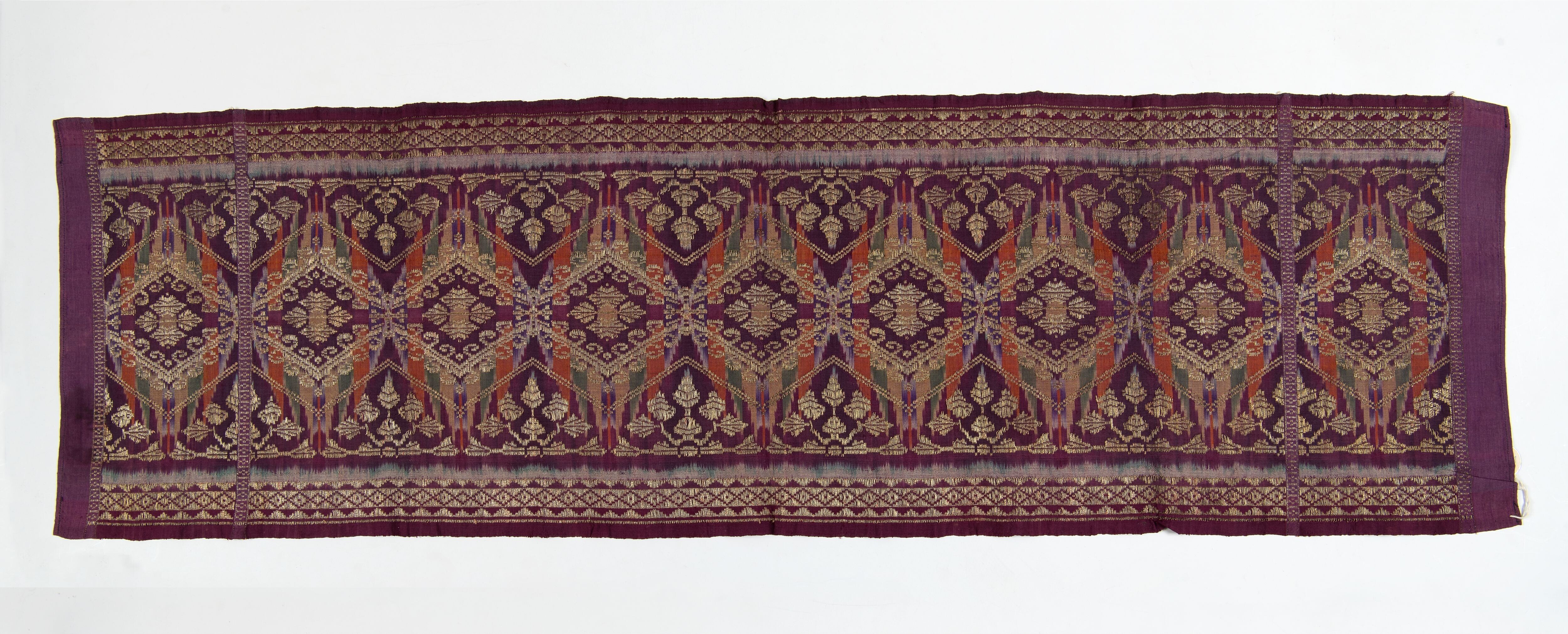 Zijden geïkat schouderdoek met ornament van goud- en...