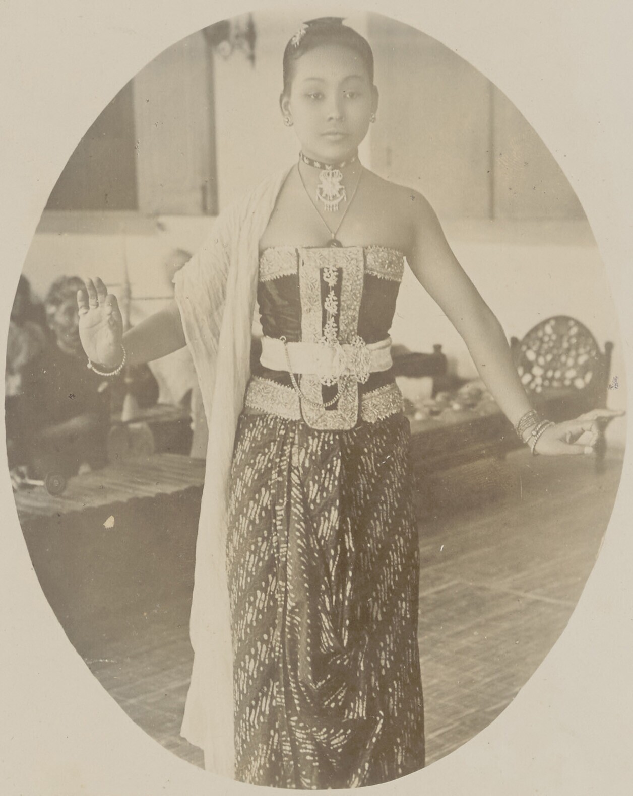 Een Javaanse danseres met om haar nek een sieraad me...
