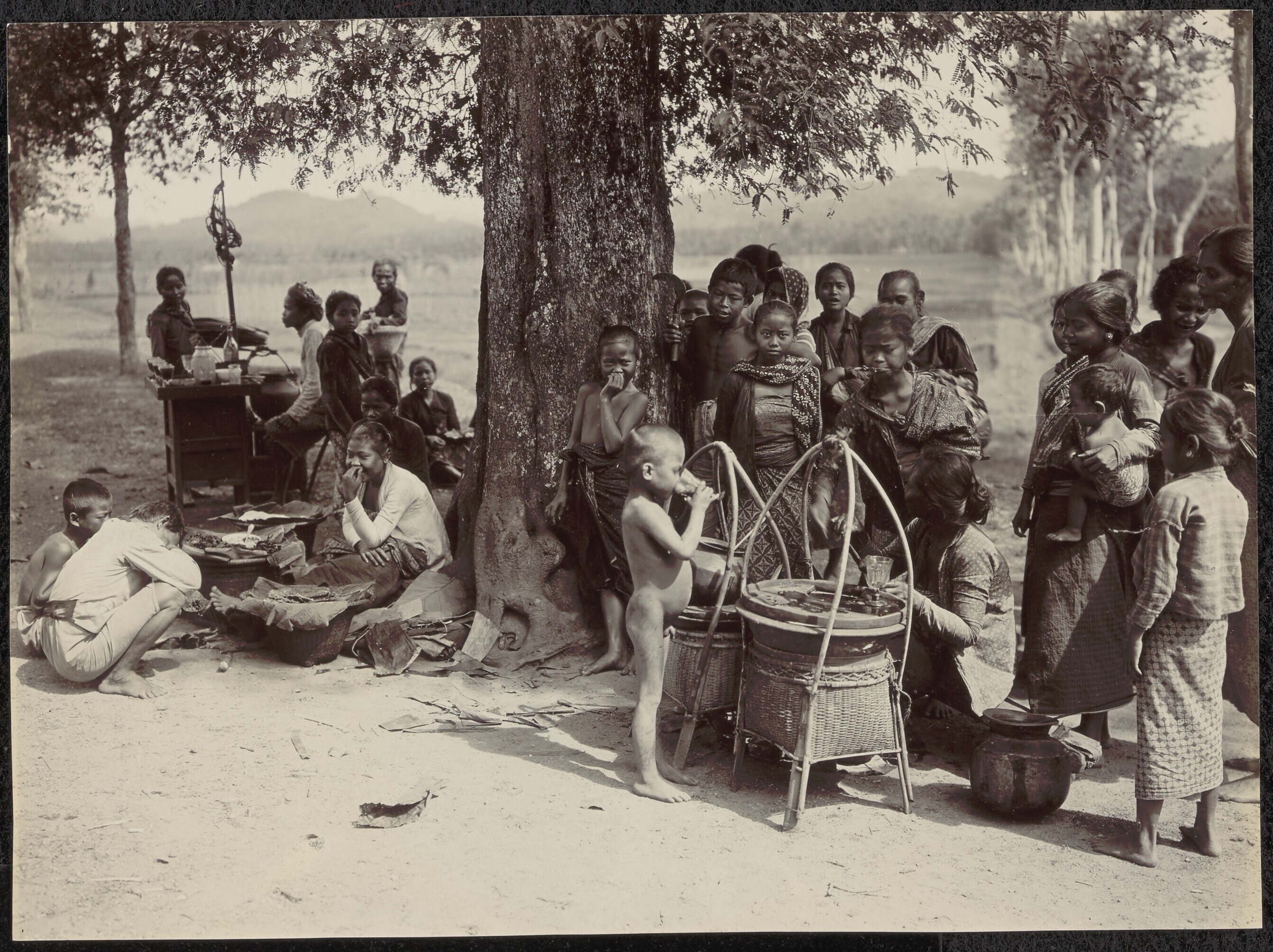 Javaanse verkopers met drank en etenswaren langs de ...