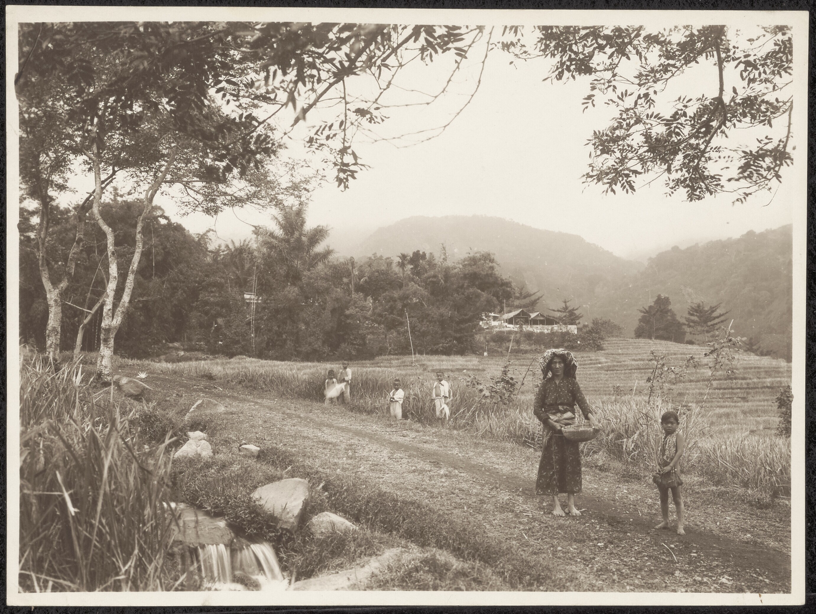 Vrouw en kinderen poseren langs een rijstveld (?) op...