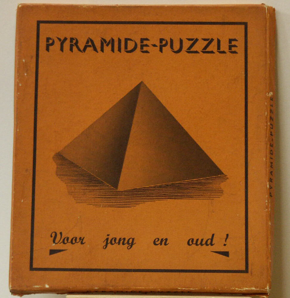 Puzzel in oranje kartonnen doos met zwarte opdruk.