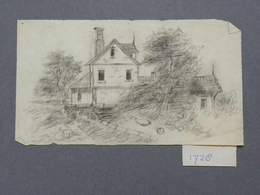 Potloodtekening, voorstellende huis met doorlaat, ca...