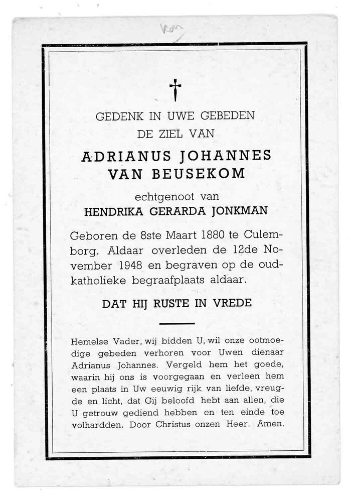 bidprent voor Adrianus Johannes van Beusekom. Gebore...