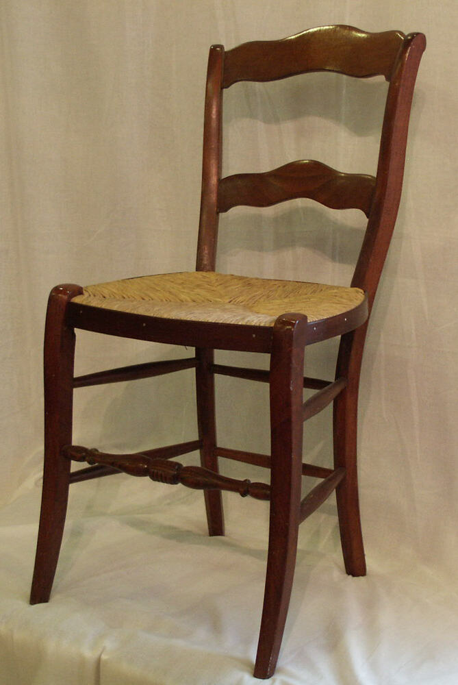 Stoel van hout, het zitraam gedekt met biezen; zogen...
