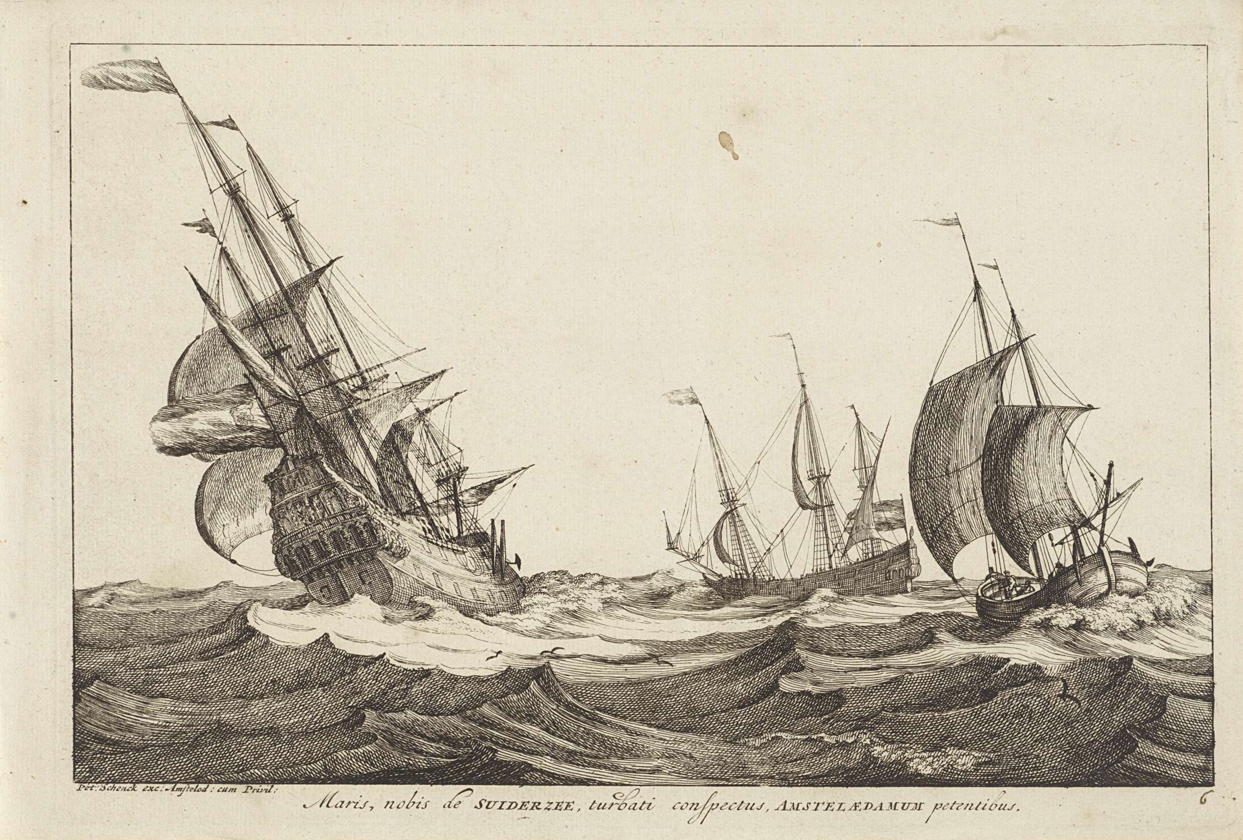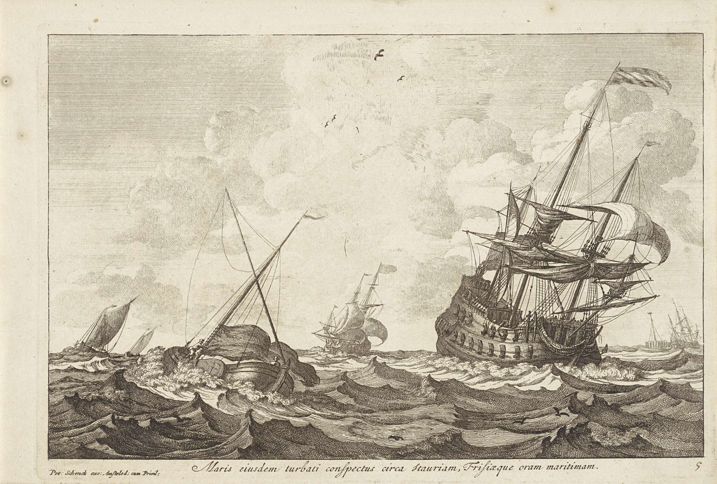 Woelige zee met rechts een oorlogsschip onder zeil