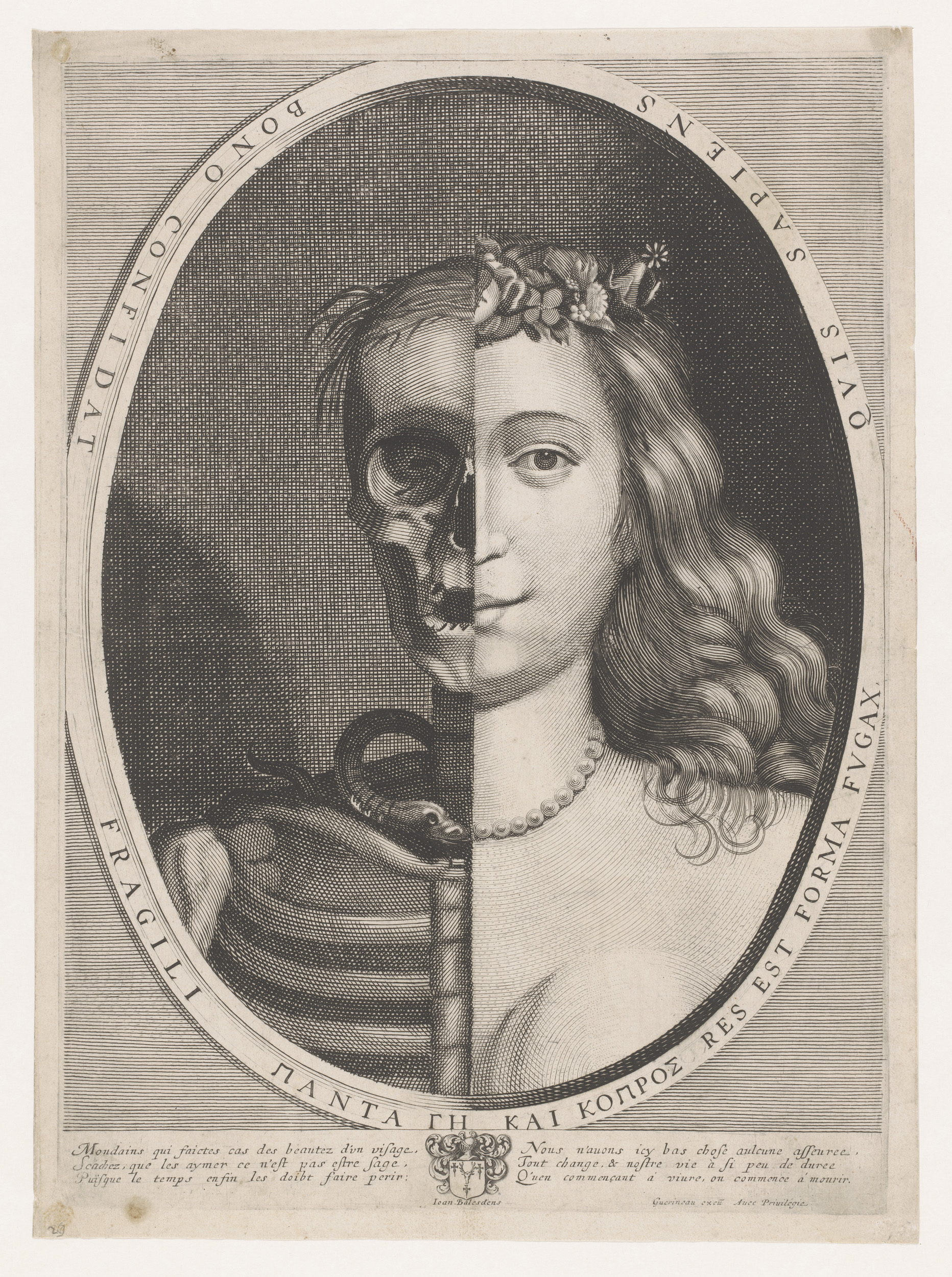 Buste van een half skelet en een half jonge vrouw