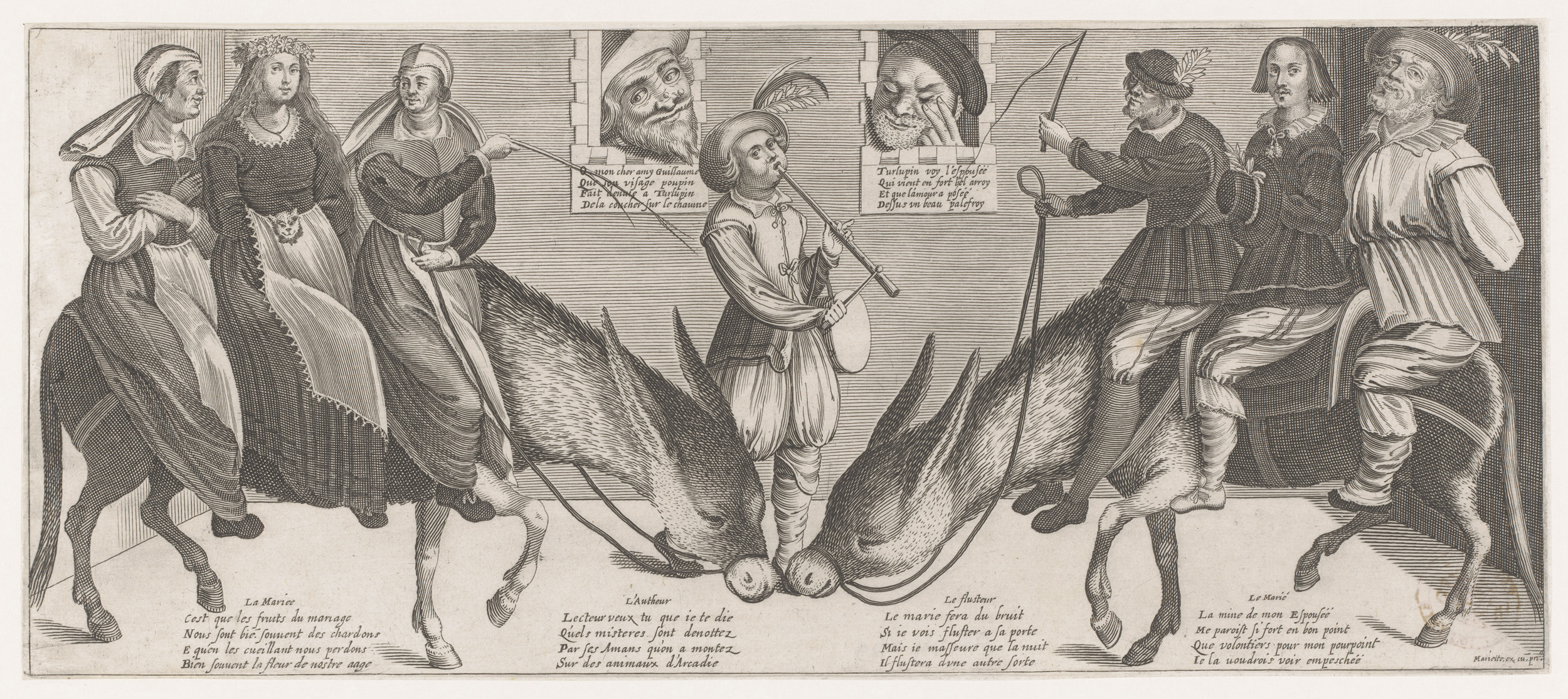 Bruid en bruidegom bij elkaar gebracht op ezels, muz...