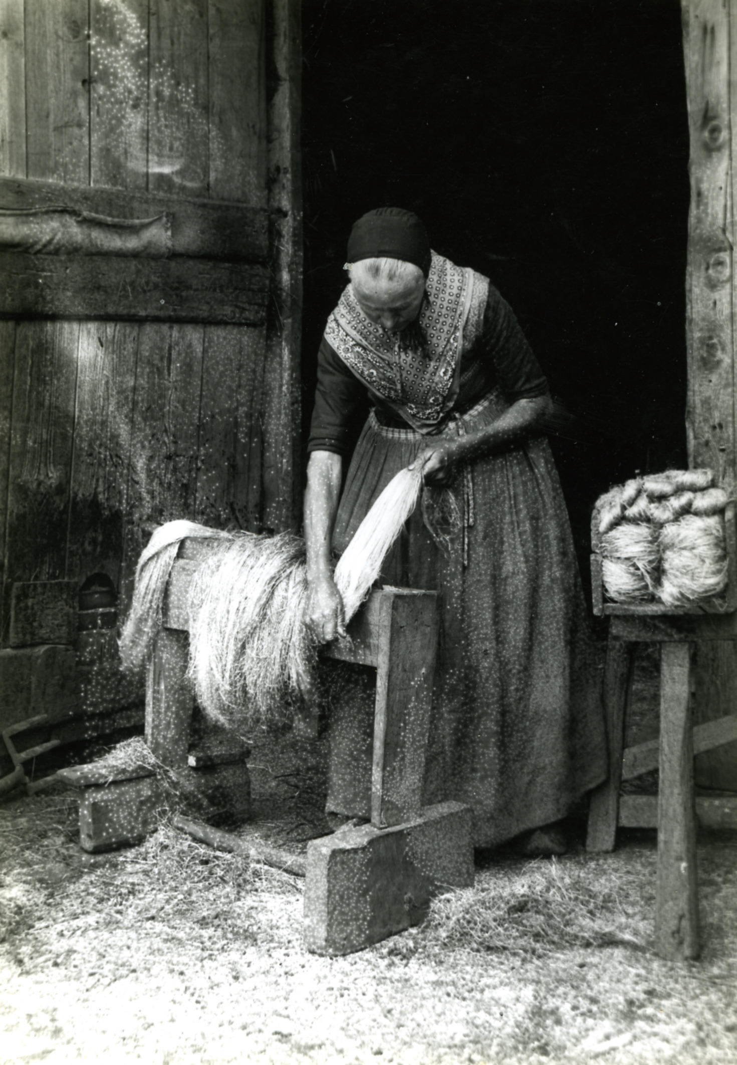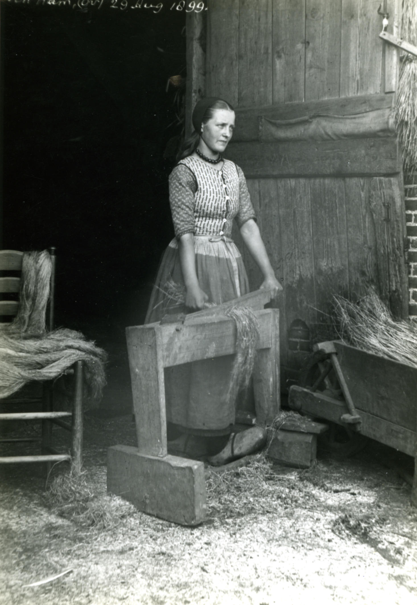 Schrapen van vlas, Den Ham, 1899 (zwart-wit foto)
