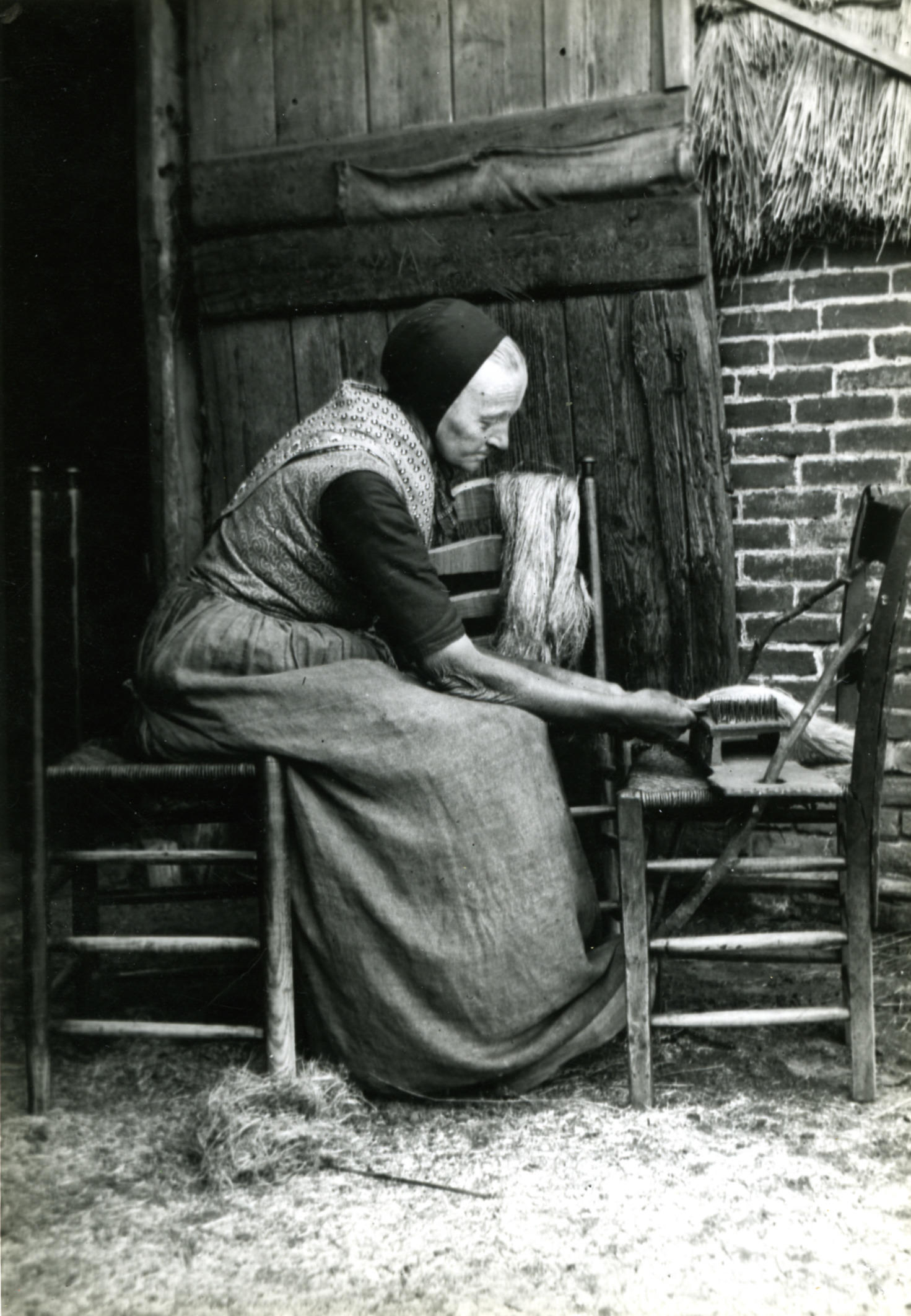 Spinnen van vlas, Den Ham, 1899 (zwart-wit foto)