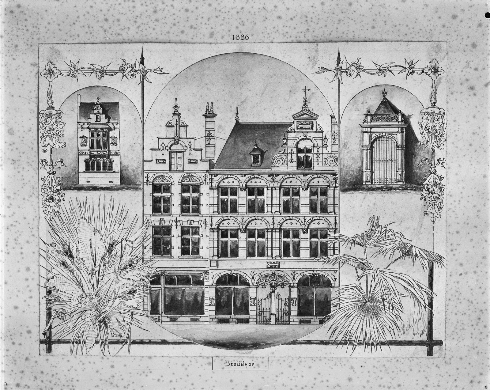 Tekening van enkele huizen aan het Begijnhof, reprod...