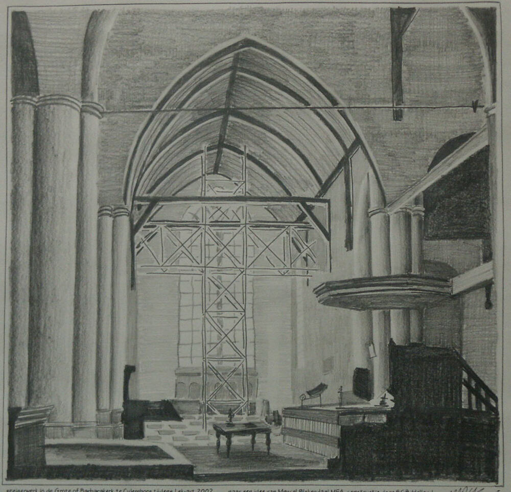 Tekening, voorstellende steiger in de Barbarakerk in...