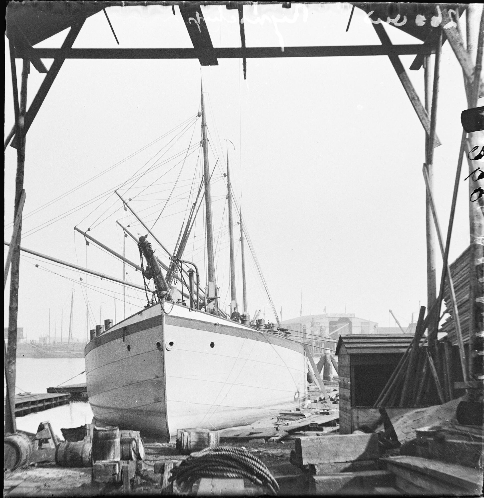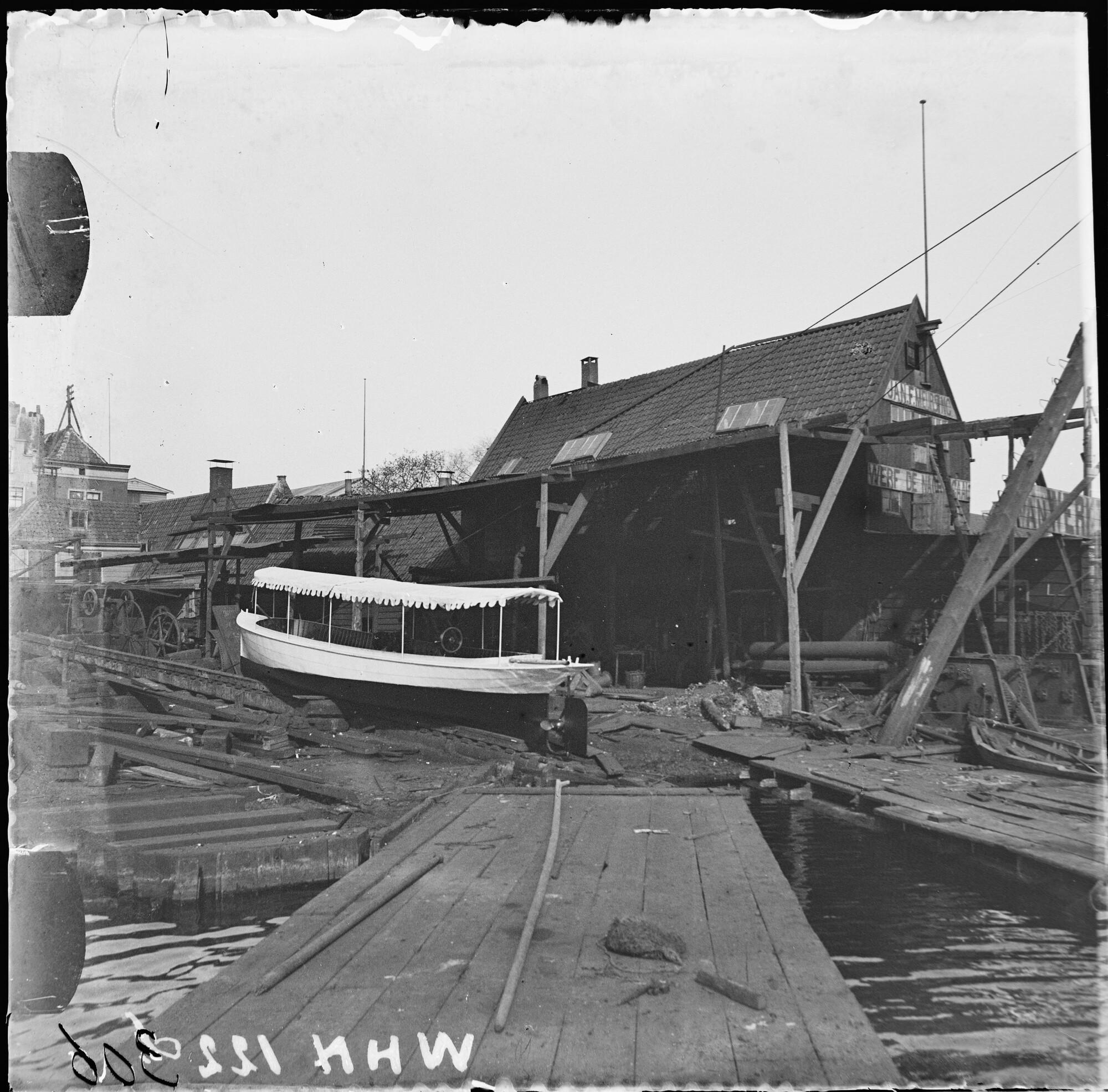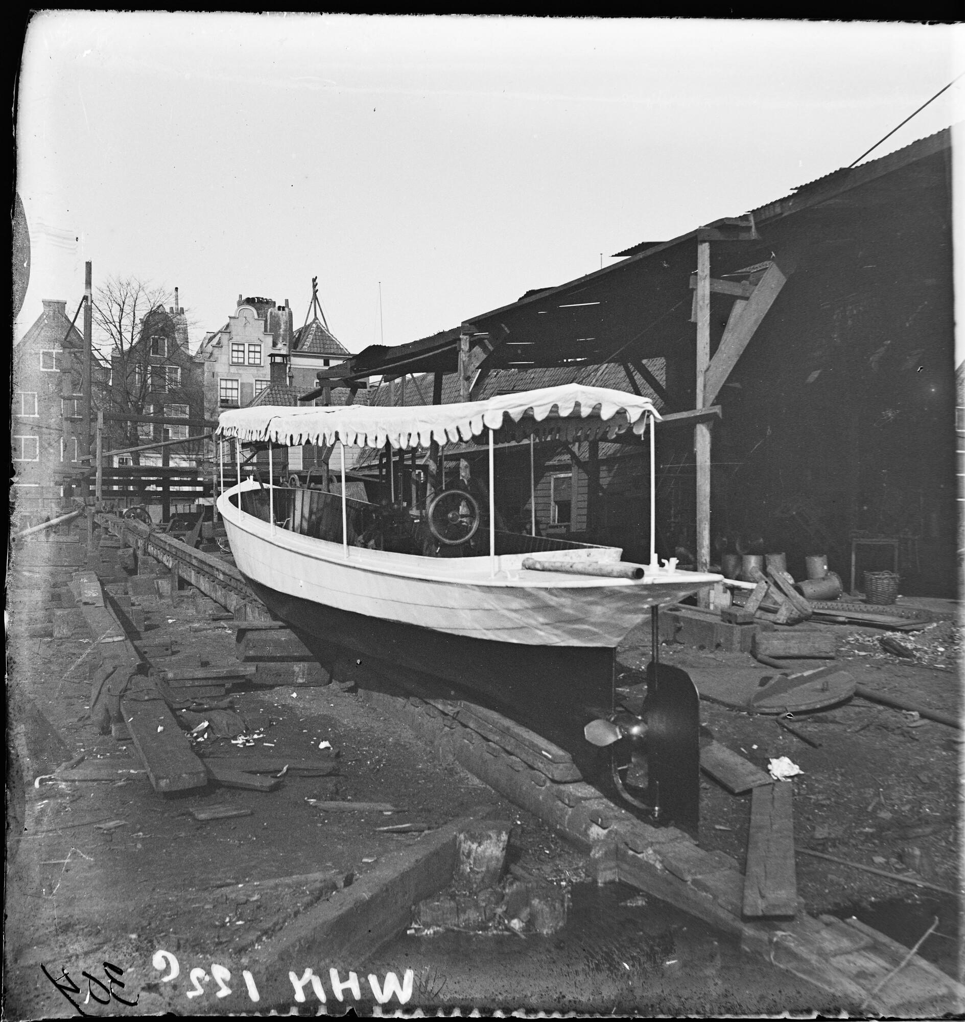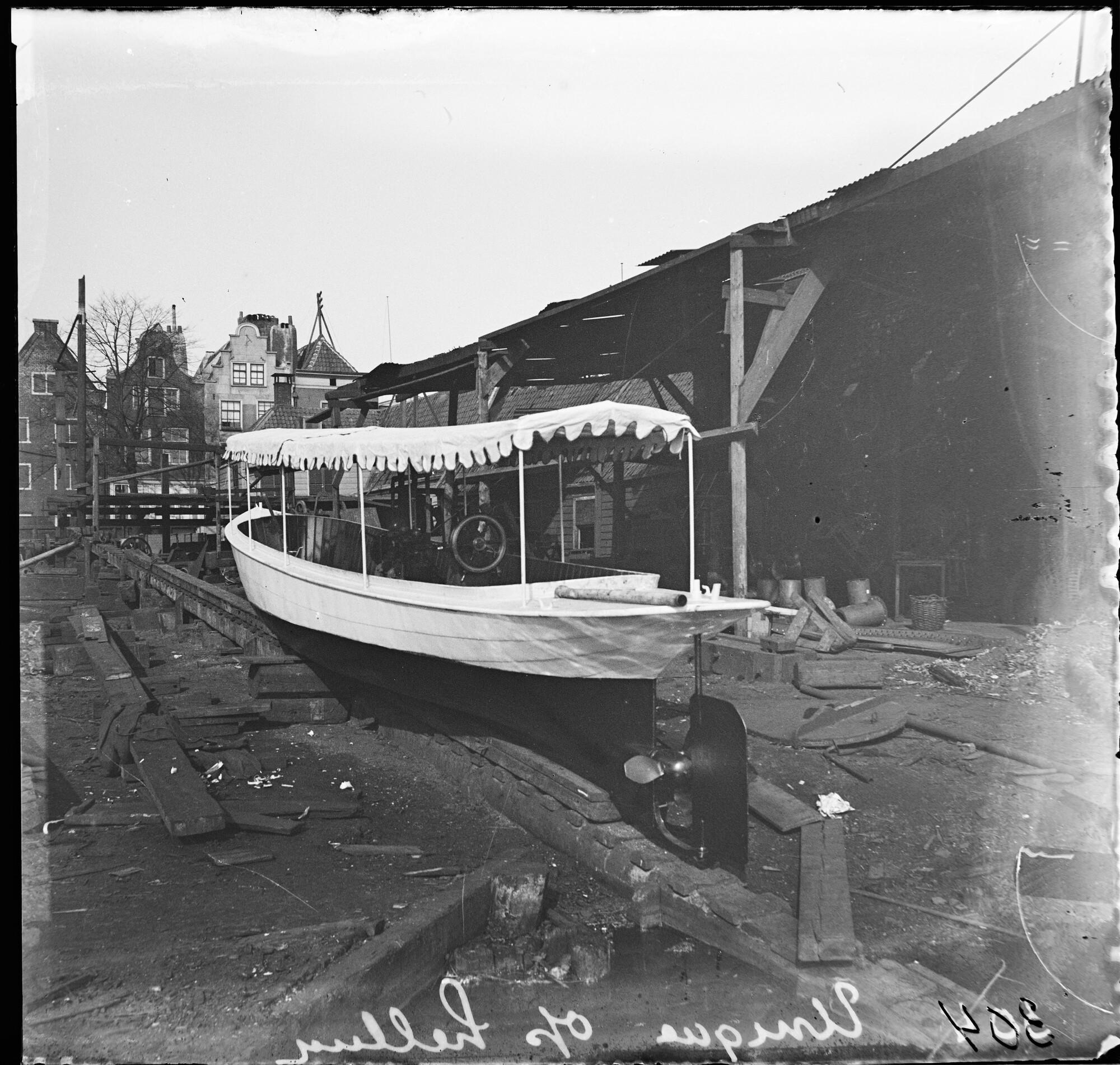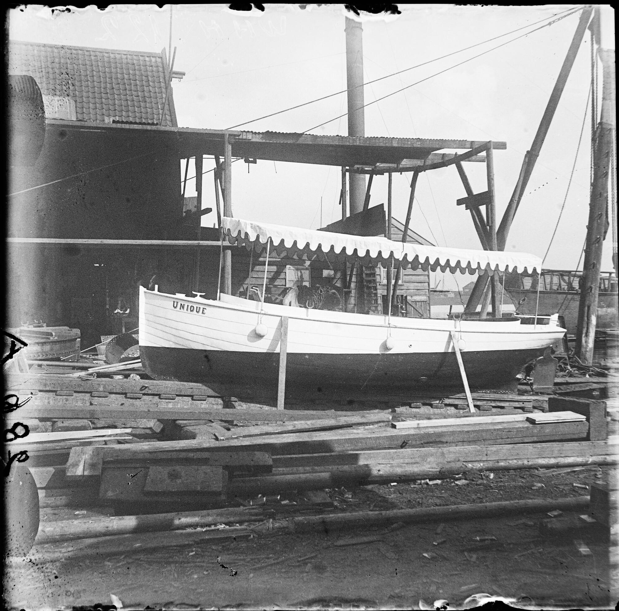 Glasnegatief van de motorsloep Unique op de helling,...
