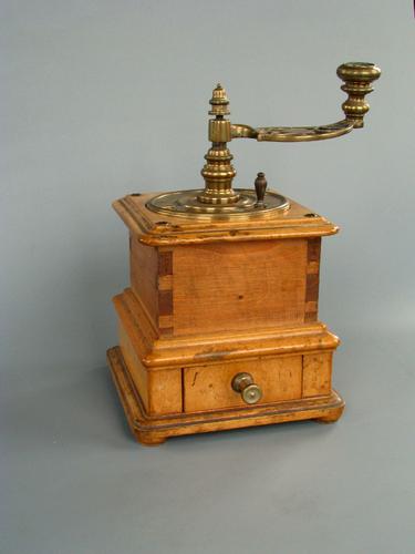 Koffiemolen, vierkant gestapeld, hout en koper.