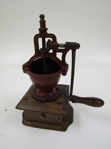 Schootkoffiemolen, blik, roodbruin gelakt