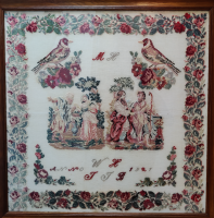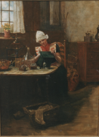 Boerenvrouw schildert een vogelkooitje