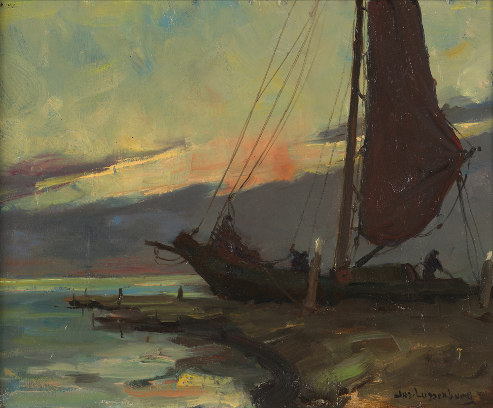 Scheepjes aan een pier bij schemer