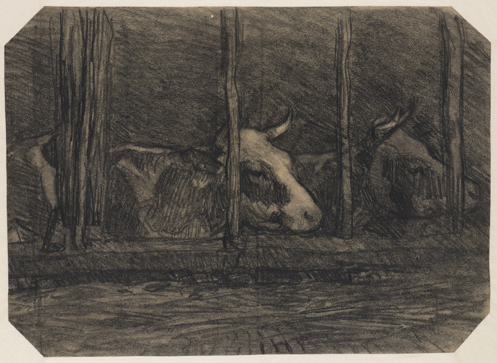 Twee koeienhoofden achter de tralies van een stal