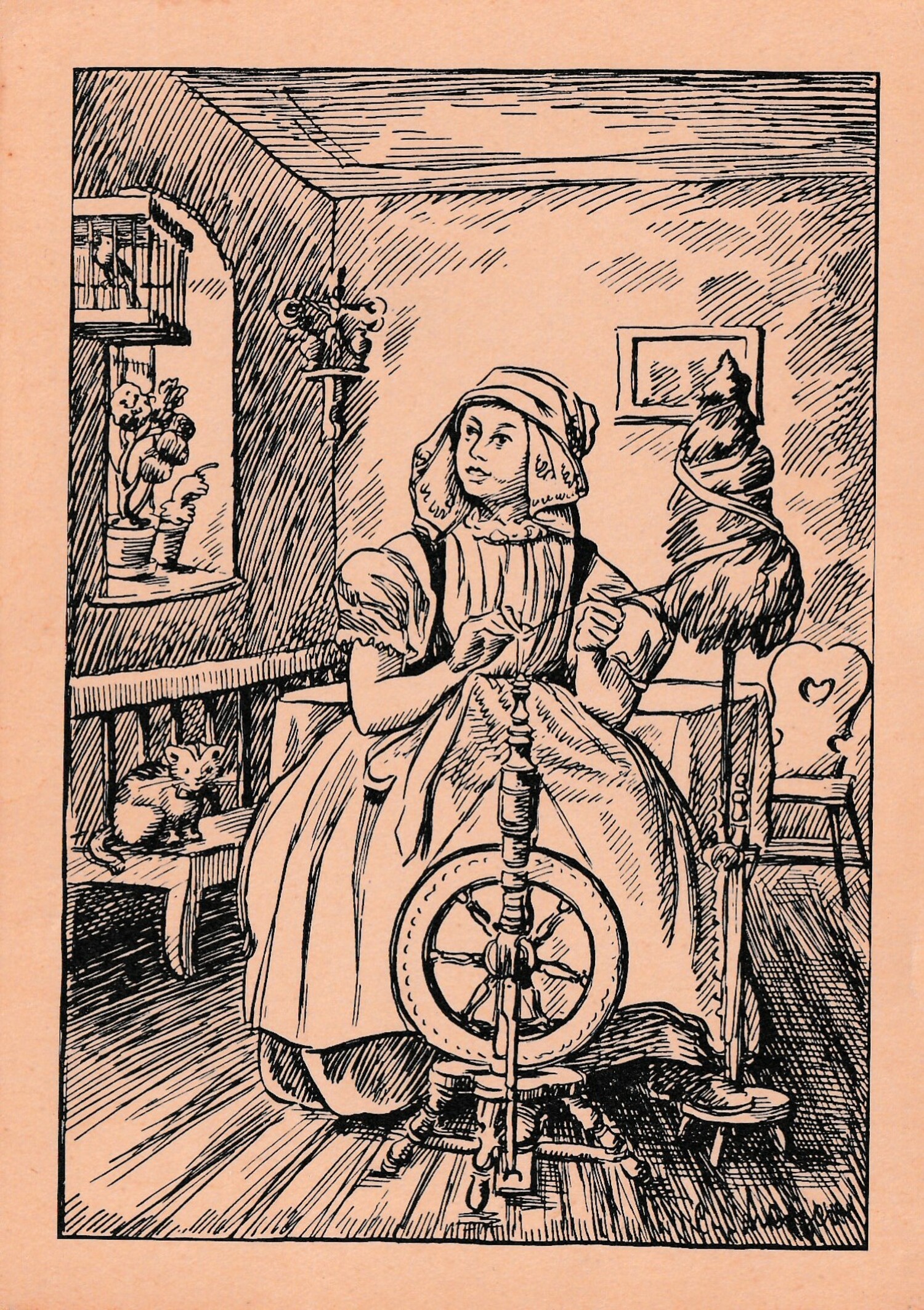 Postcard: Woman spinning