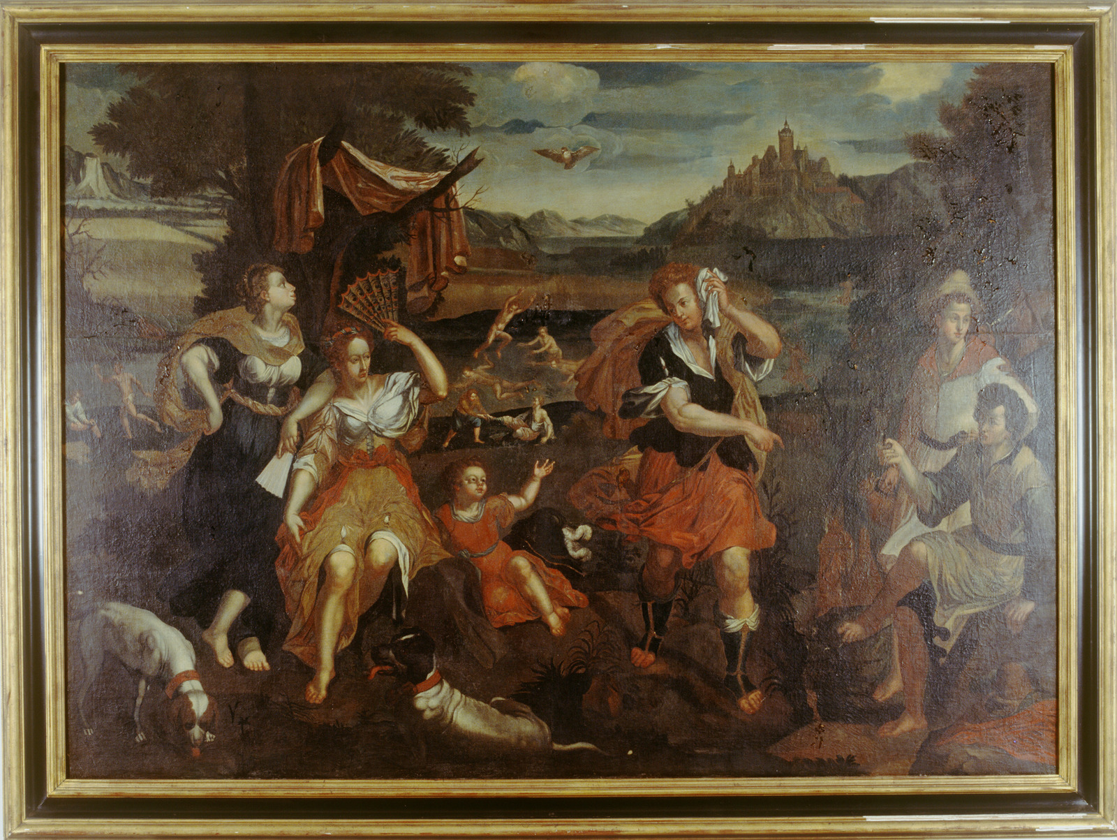 Een jager met paard en een vrouw in een landschap