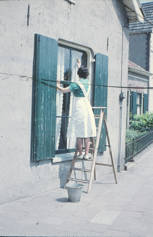 Bergstraat met een gezinsverzorgster, die de ramen lapt