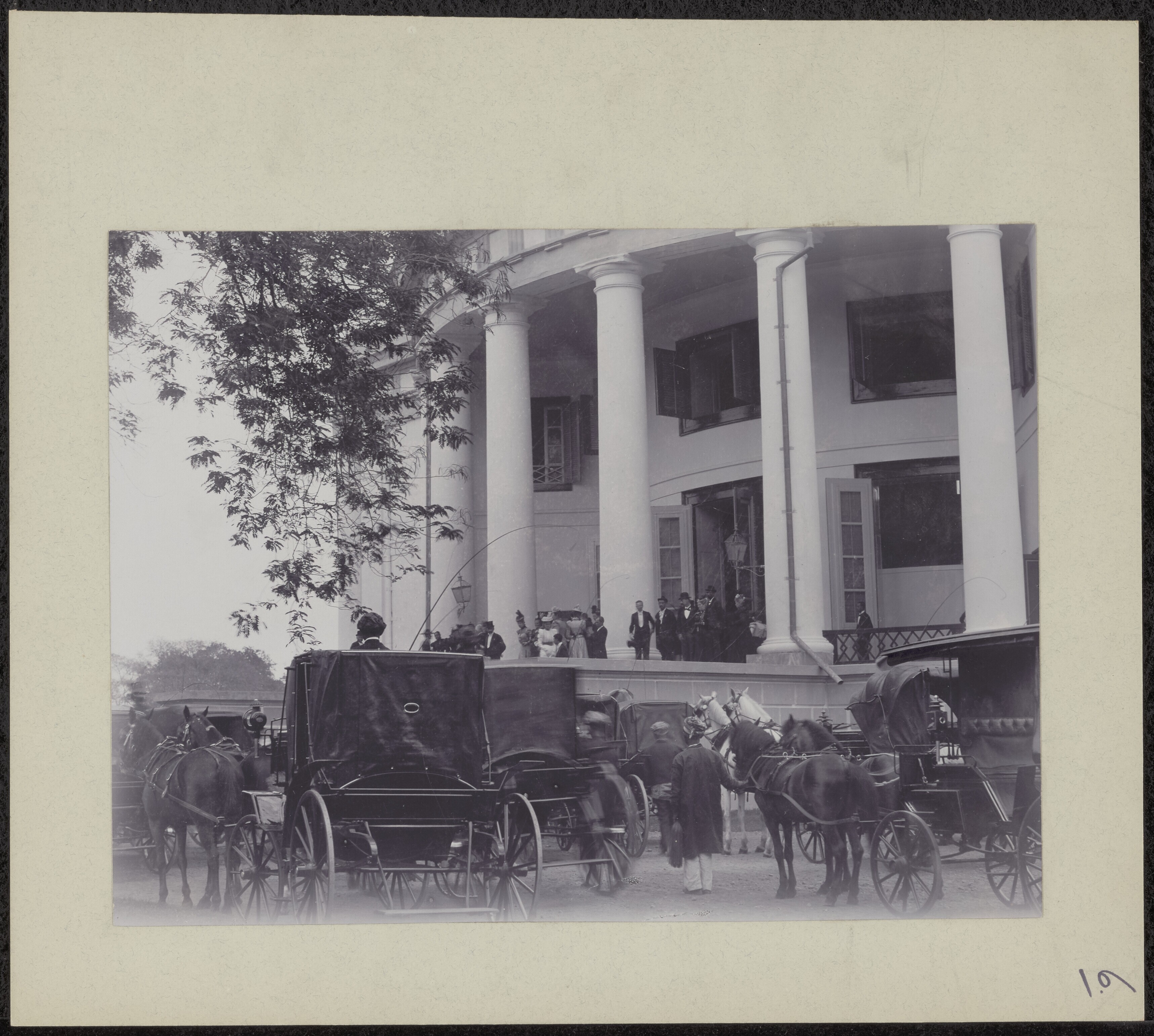 Wachtende koetsen naast de Willemskerk in Batavia