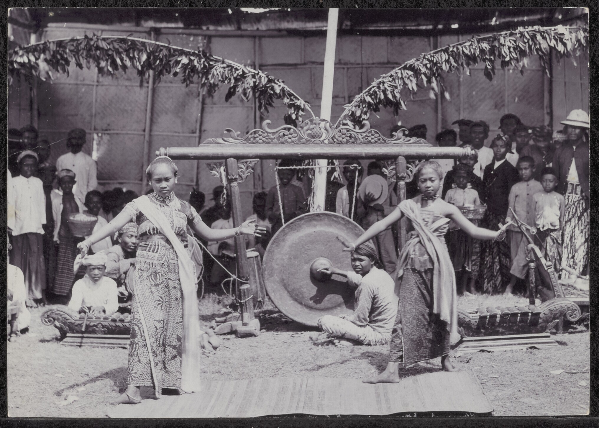 Twee danseressen begeleid door een gamelanorkest op ...