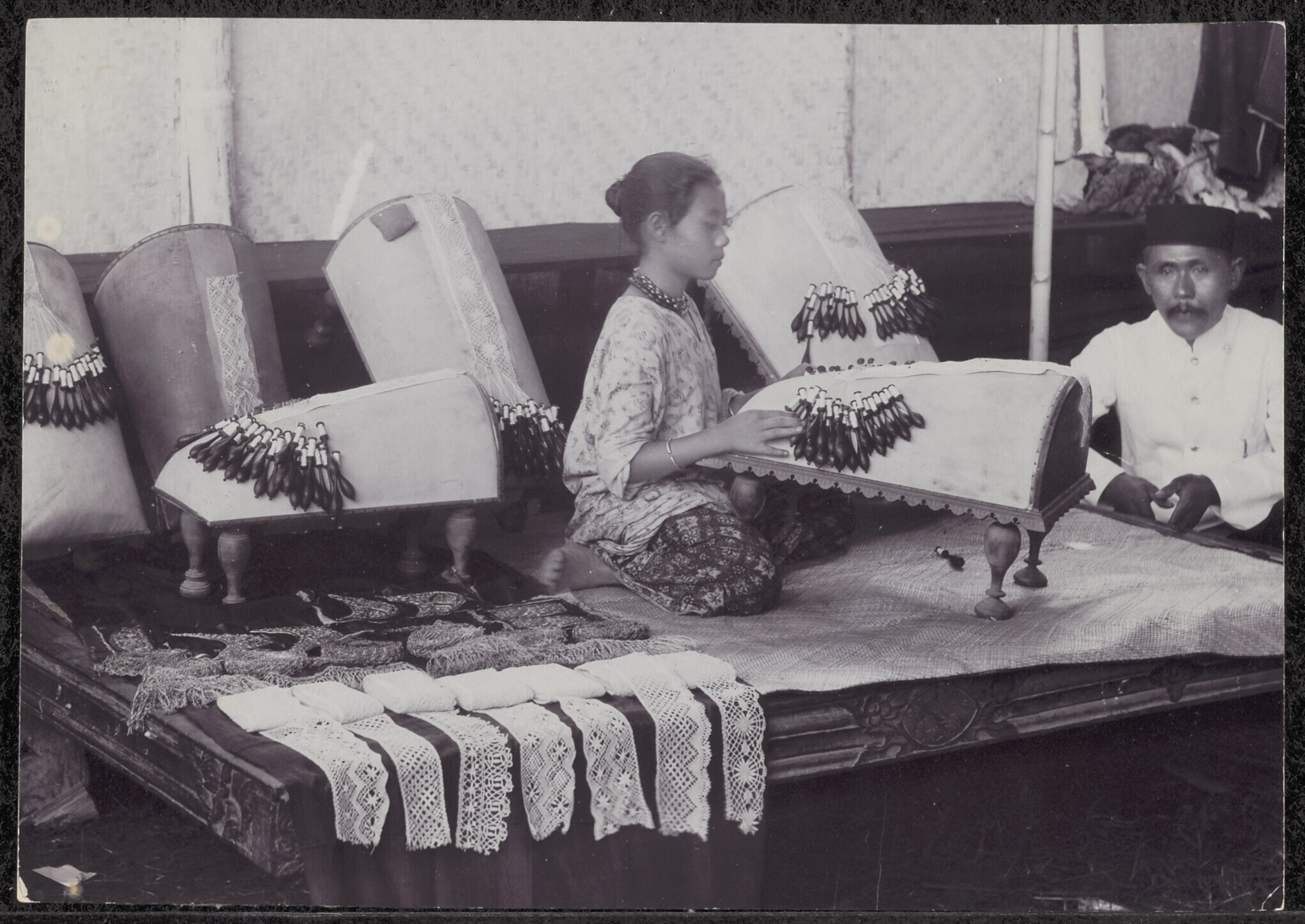 Meisjes vervaardigen kantwerk in een werkplaats op S...