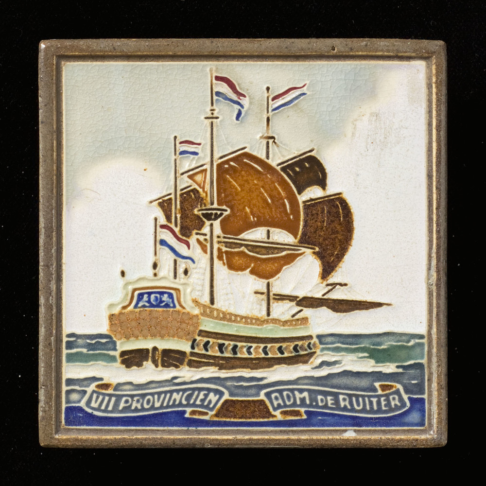 Tegel in cloisonné-techniek, met voorstelling: Schip...
