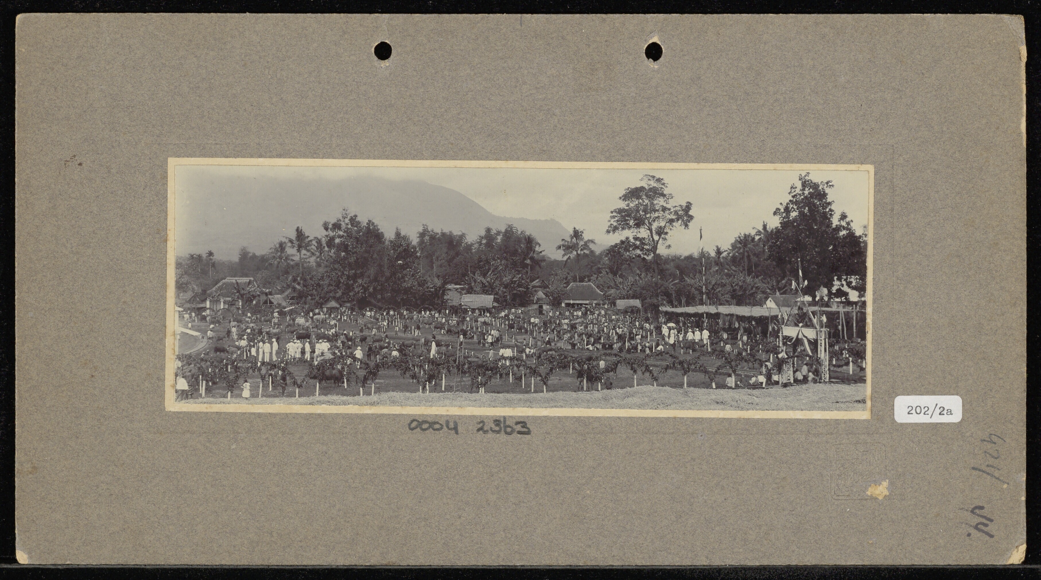Een menigte Europeanen en Javanen bijeen op een open...