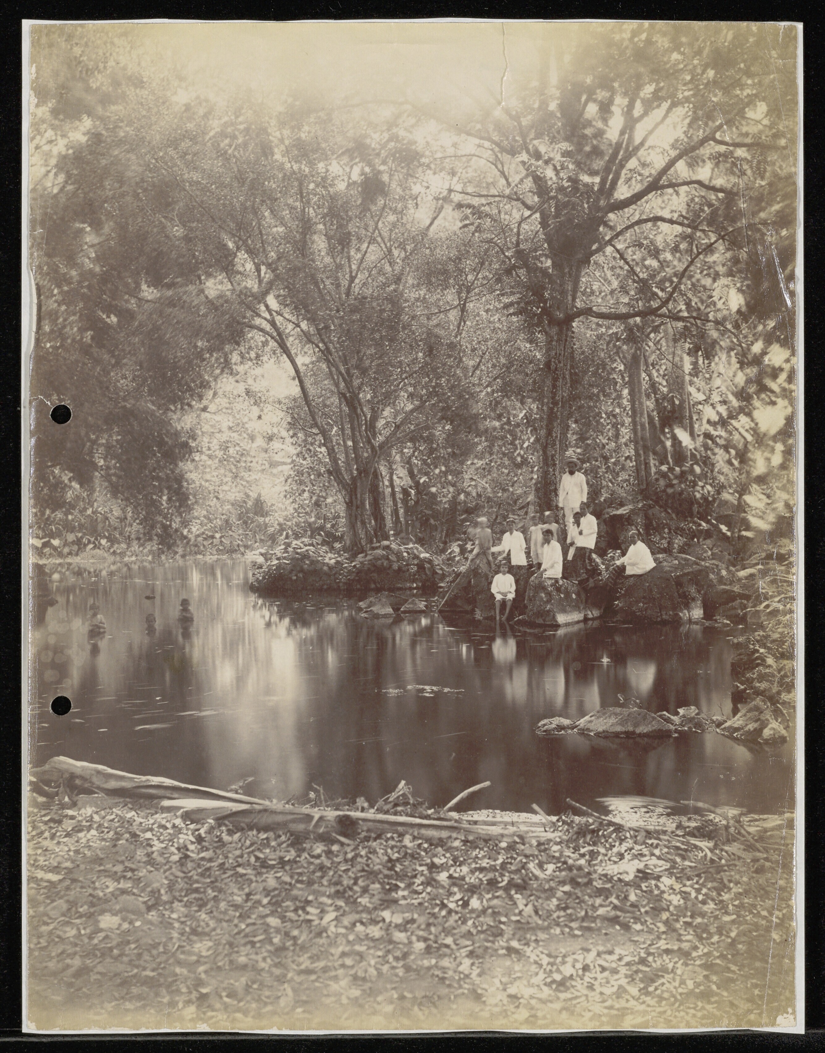 Een groep zwemmende Indonesiërs en langs de kant van...