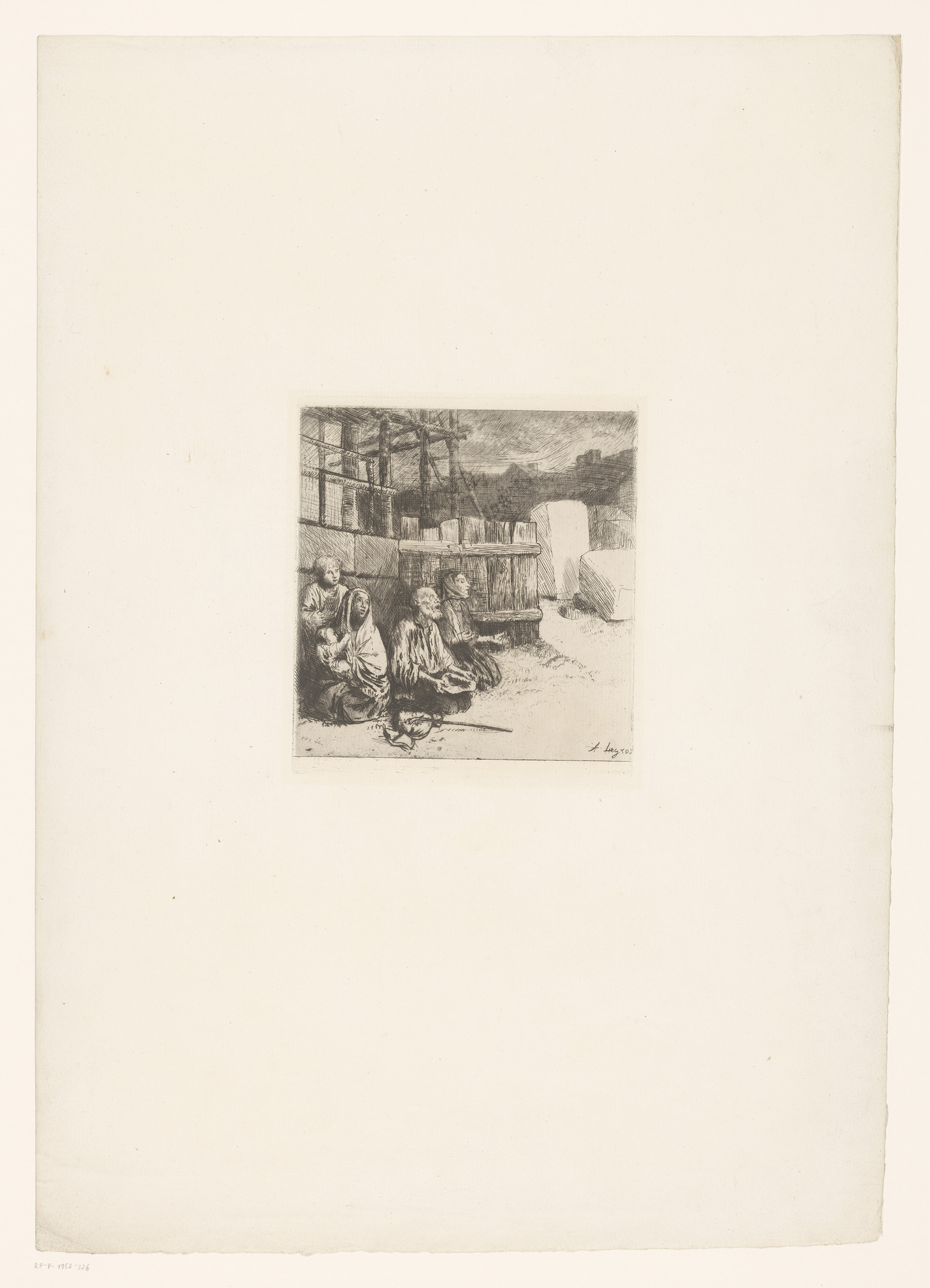 Knielende bedelaars tegen een schutting