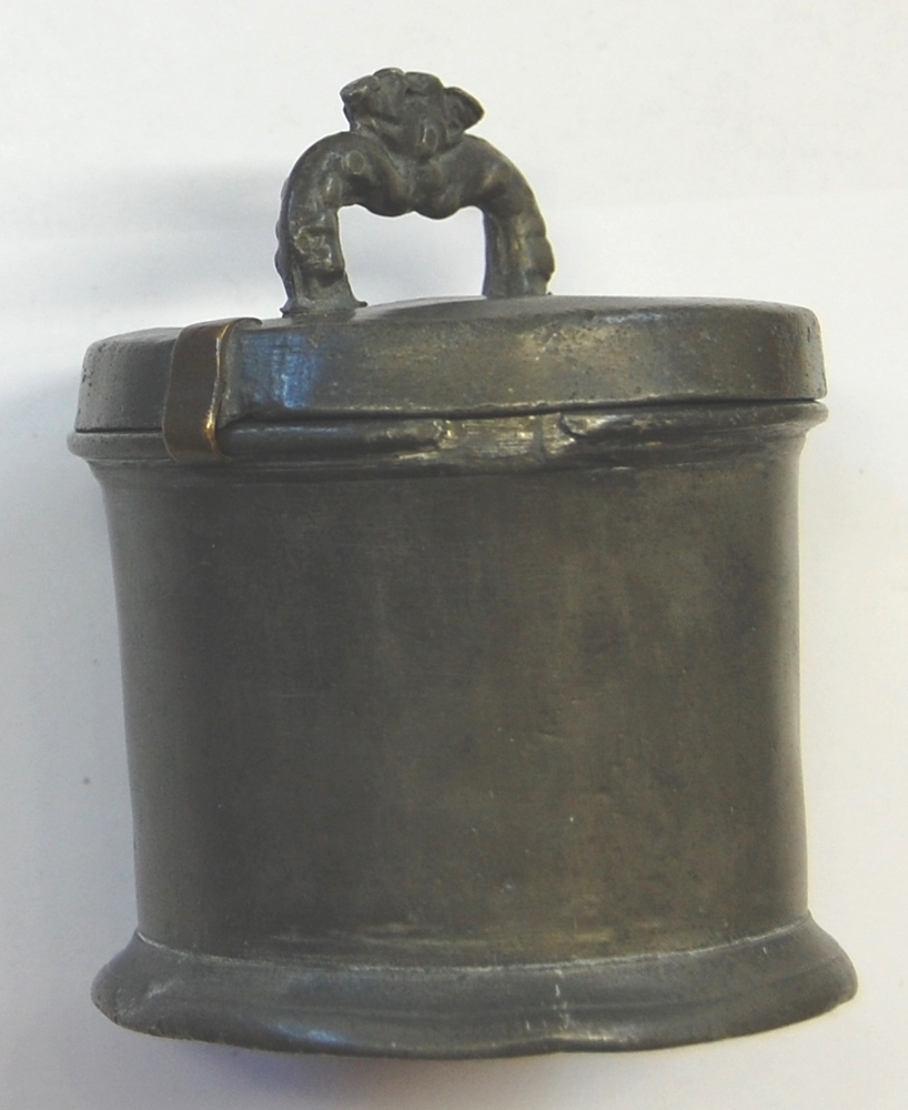 gortbus met plat gekroond deksel en oor. Tin. Period...