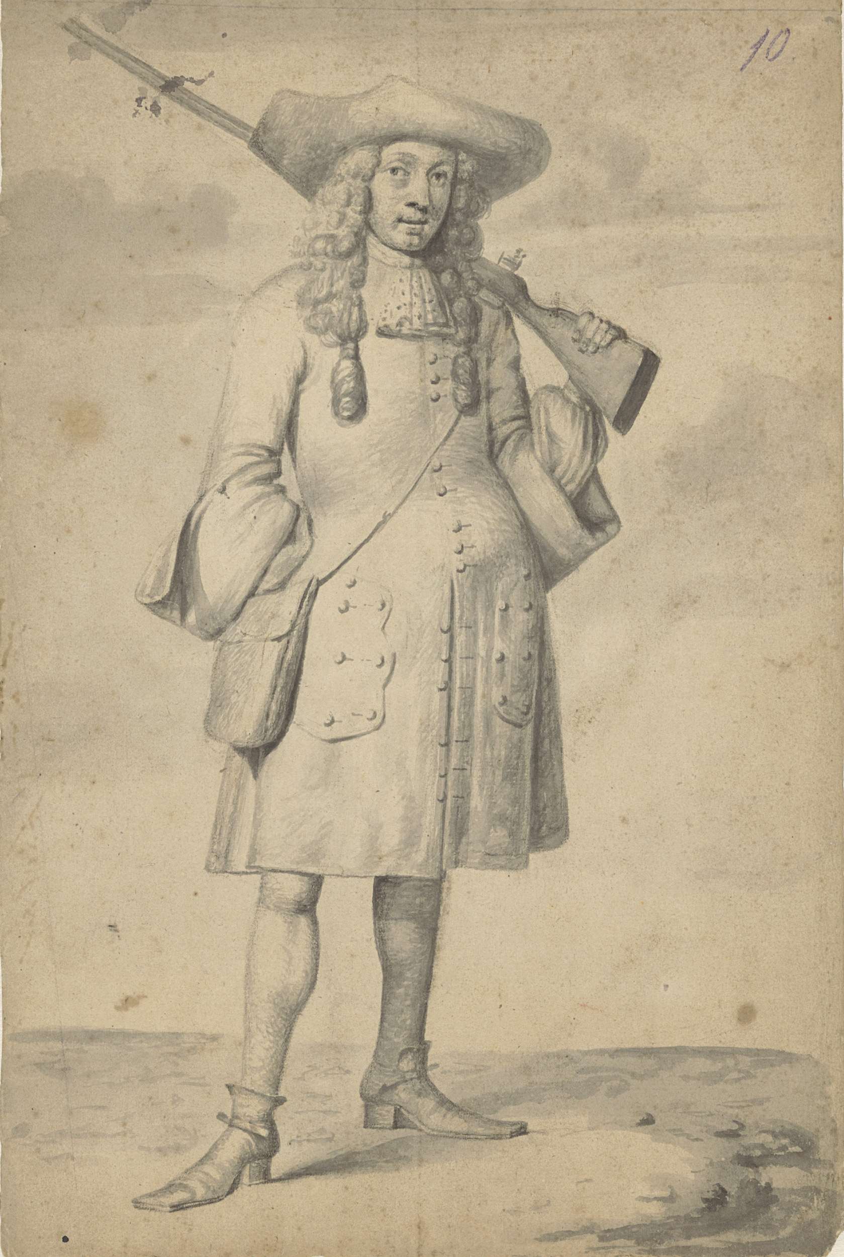 Staande man met geweer, op de rug gezien