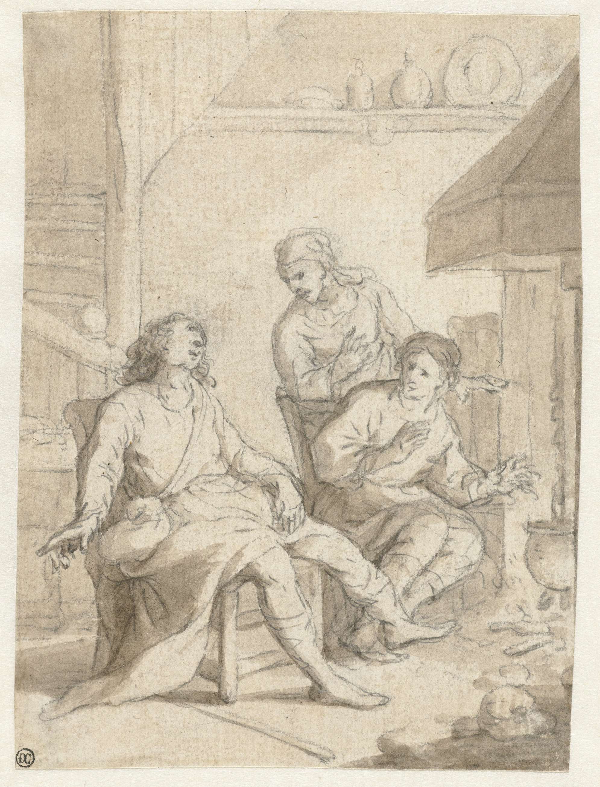 Man en twee vrouwen in een keuken bij het vuur