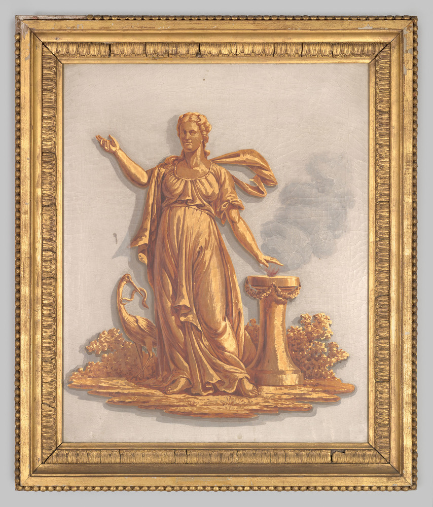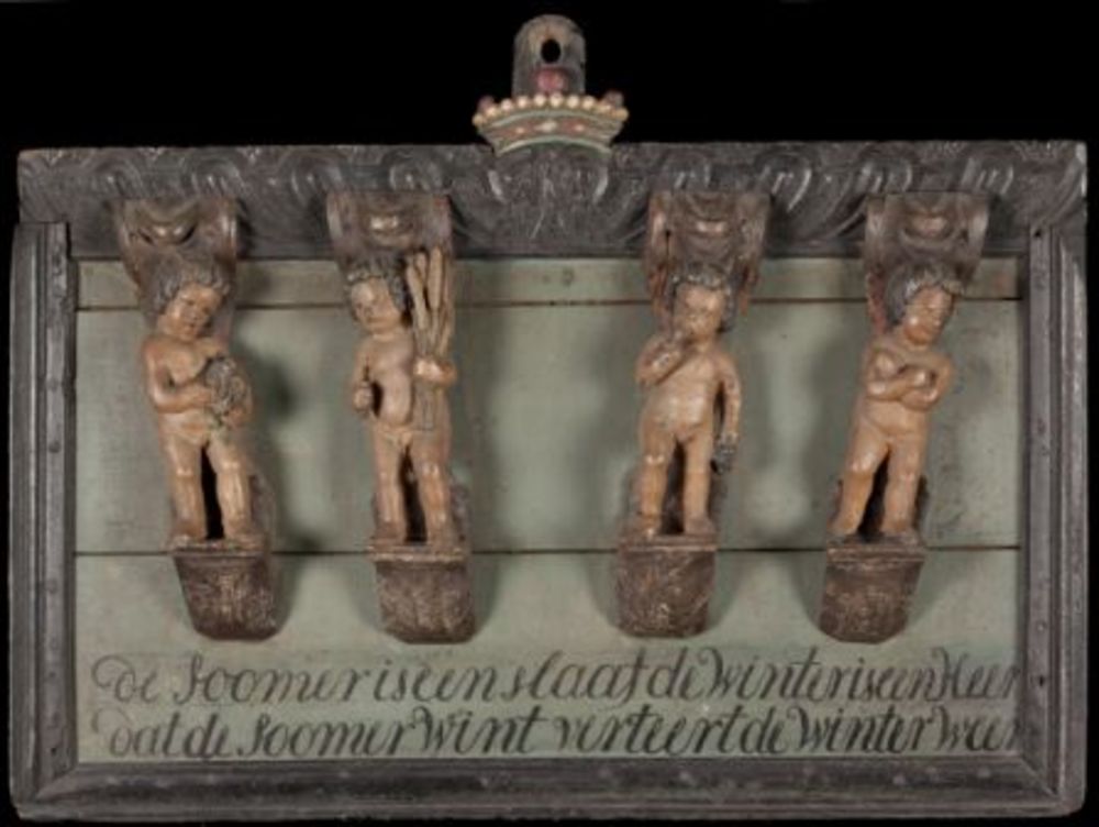 Wandbord van eikenhout met snijwerk. Vier naakte kin...