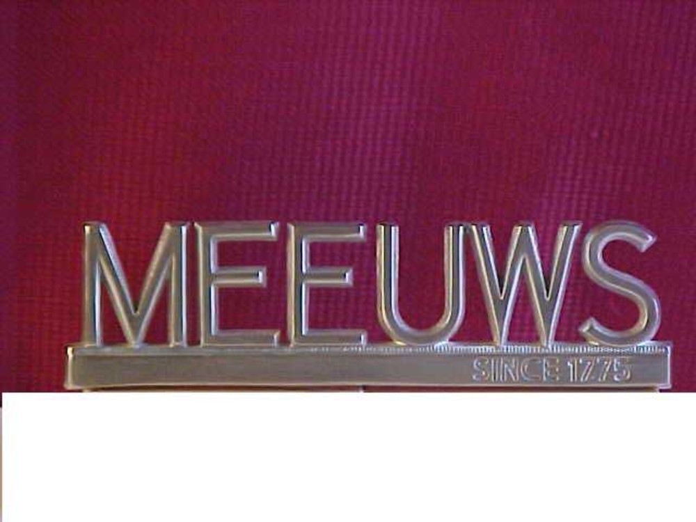 Reclamebord van tin en hout van Meeuws te Den Haag
