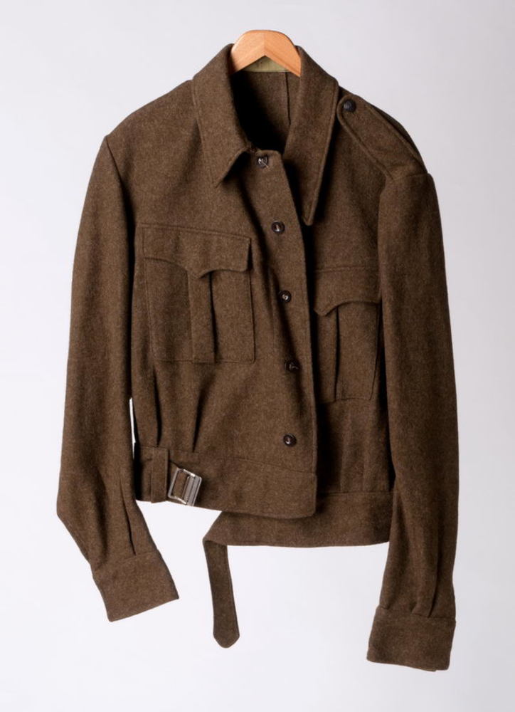 Legerjack van groene wollen stof, gedragen bij de la...
