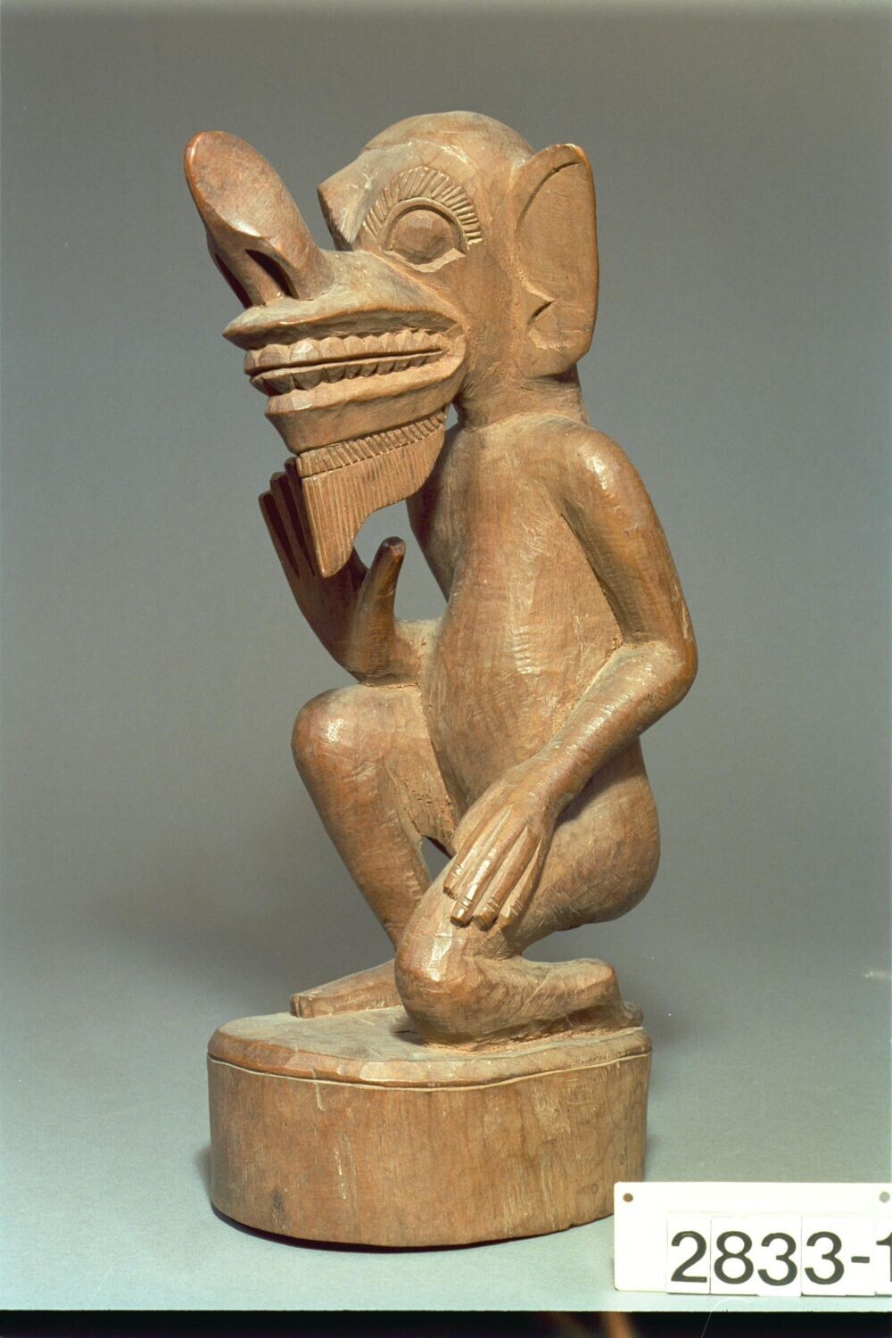 Houten beeld van een knielend antropomorf figuur
