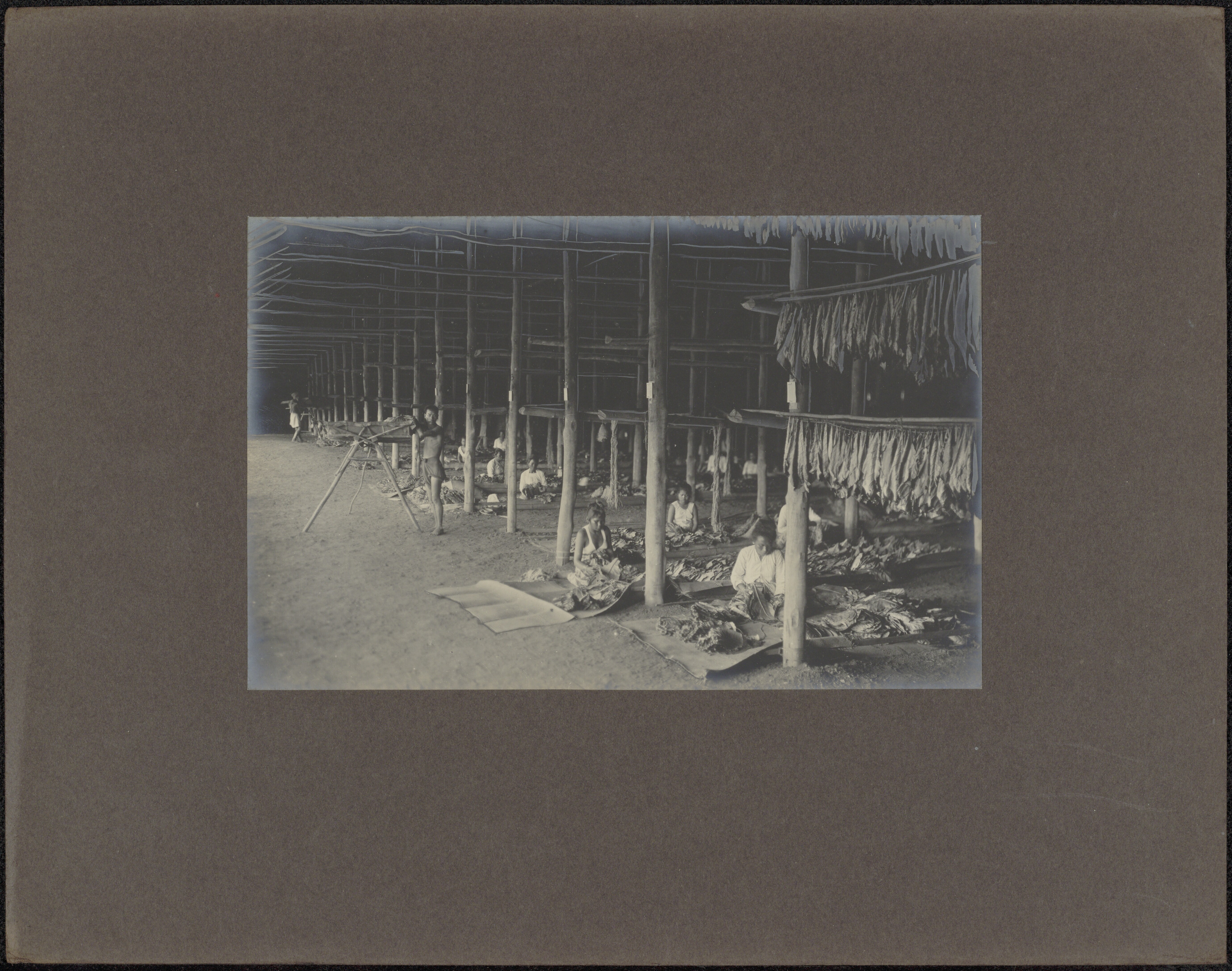 Het aaneenrijgen van de tabaksbladeren in de droogsc...