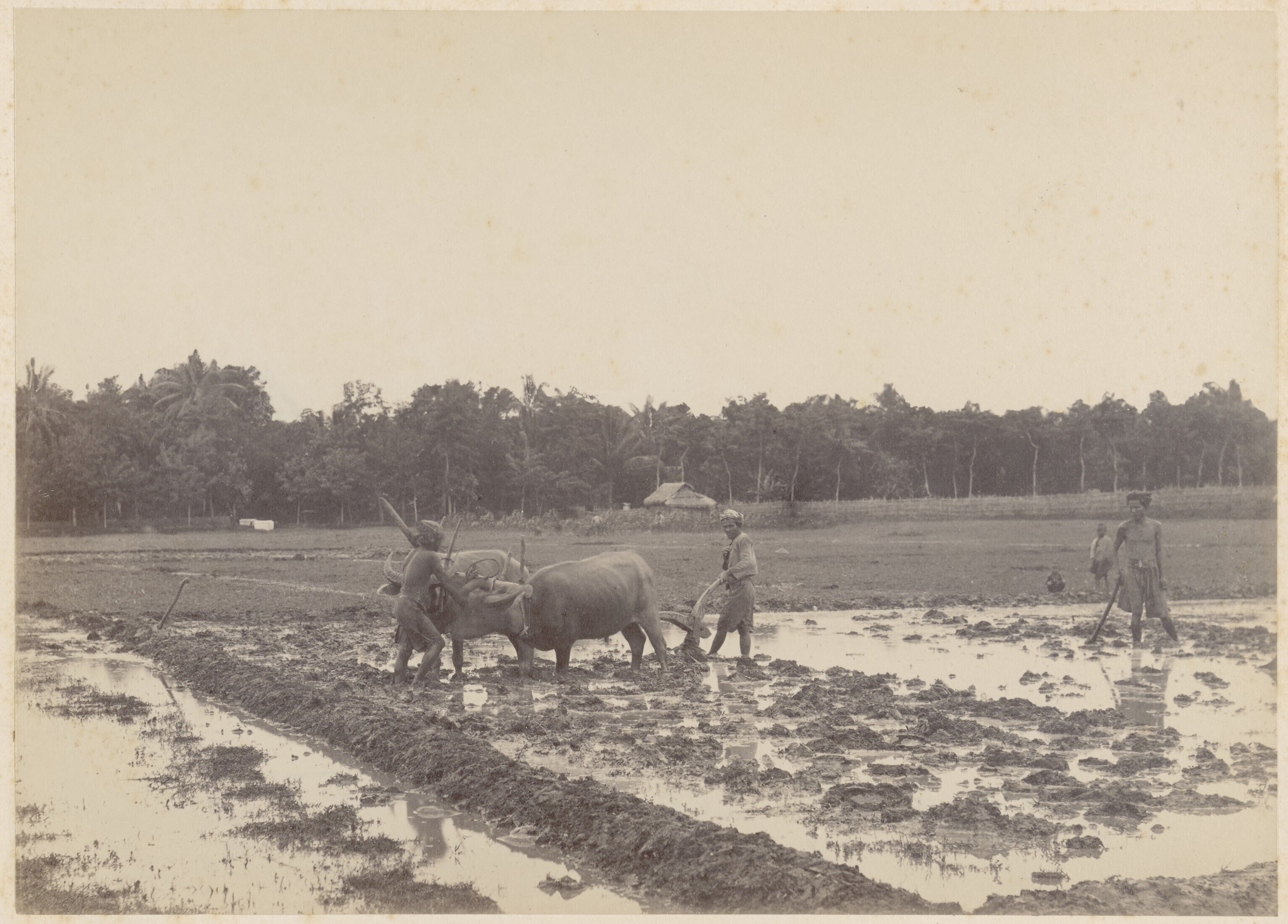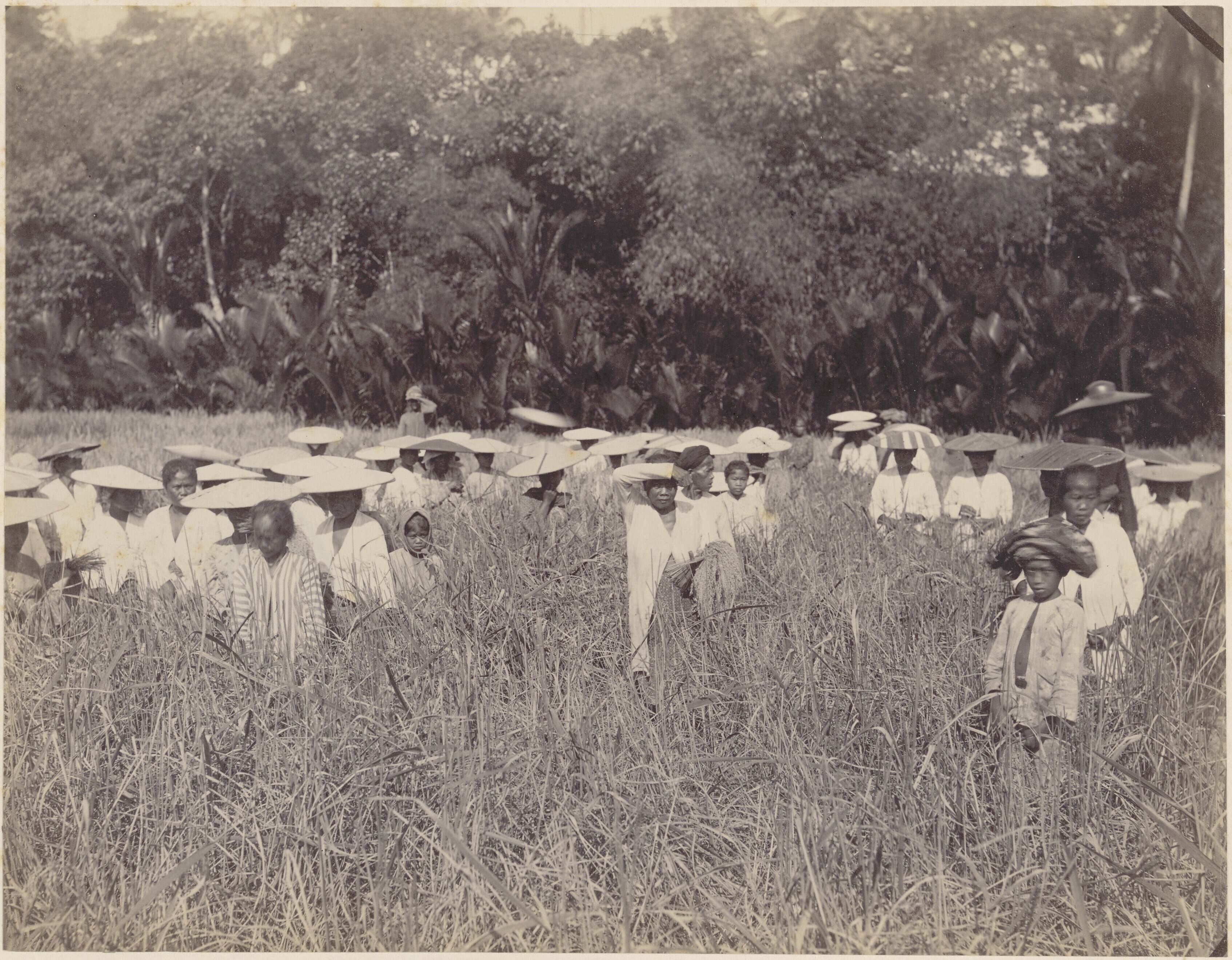 Het oogsten en opstapelen van rijst door Javaanse ma...