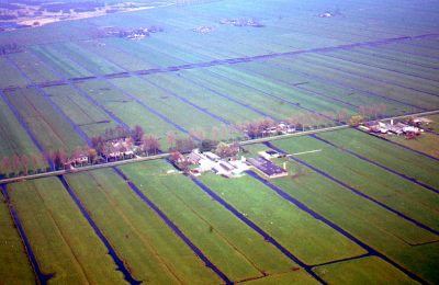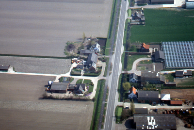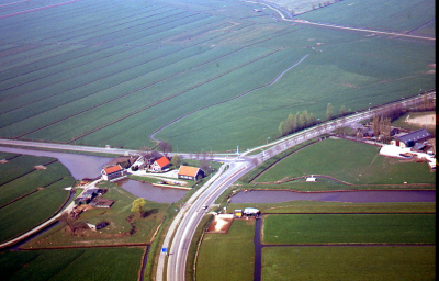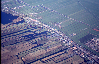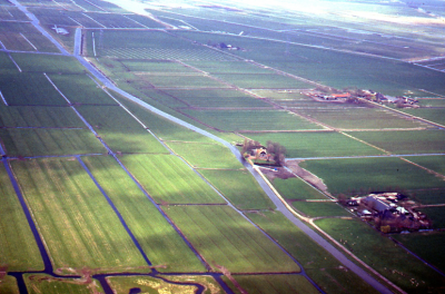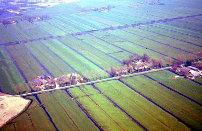 Luchtfoto van een weg met bebouwing in een kleipolder.