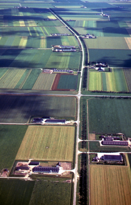 Luchtfoto van Zuidelijk Flevoland met boerderijen.