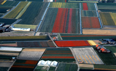 Luchtfoto van bollenvelden in de Noordoostpolder.
