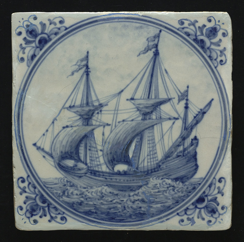 Tegel van keramiek, tinglazuur, voorstellende schepe...