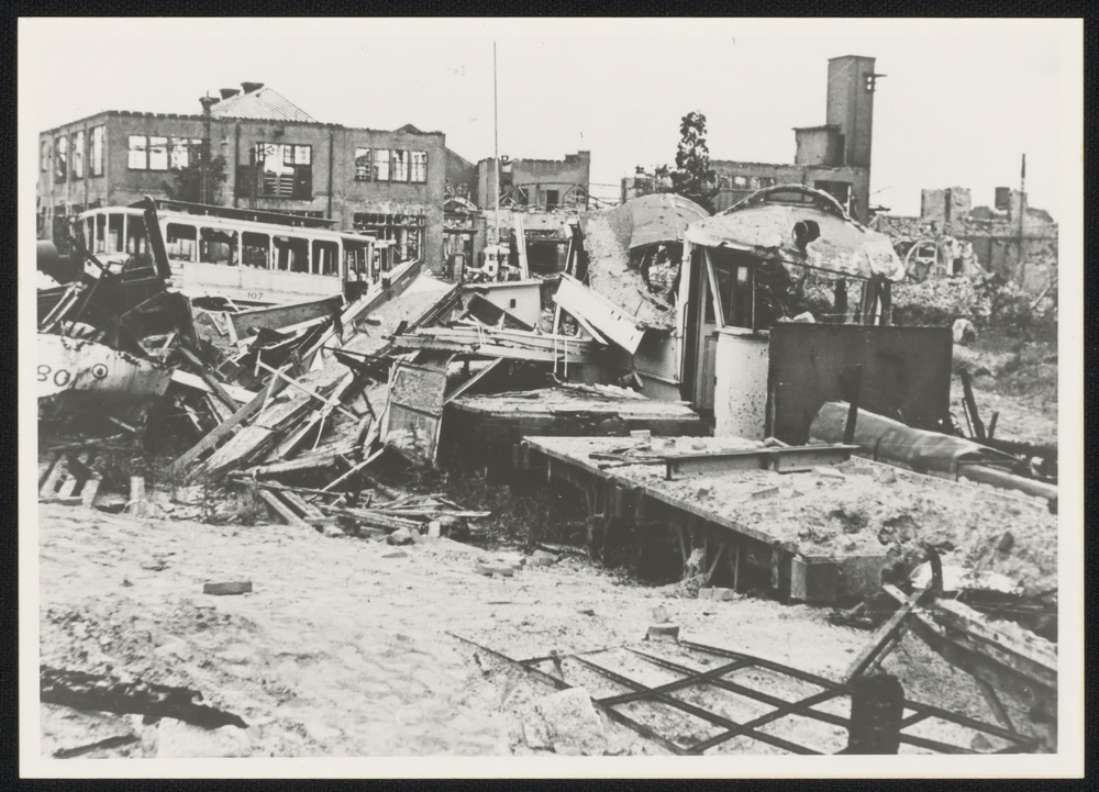 Reproductiefoto van beschadigde gebouwen een tramste...