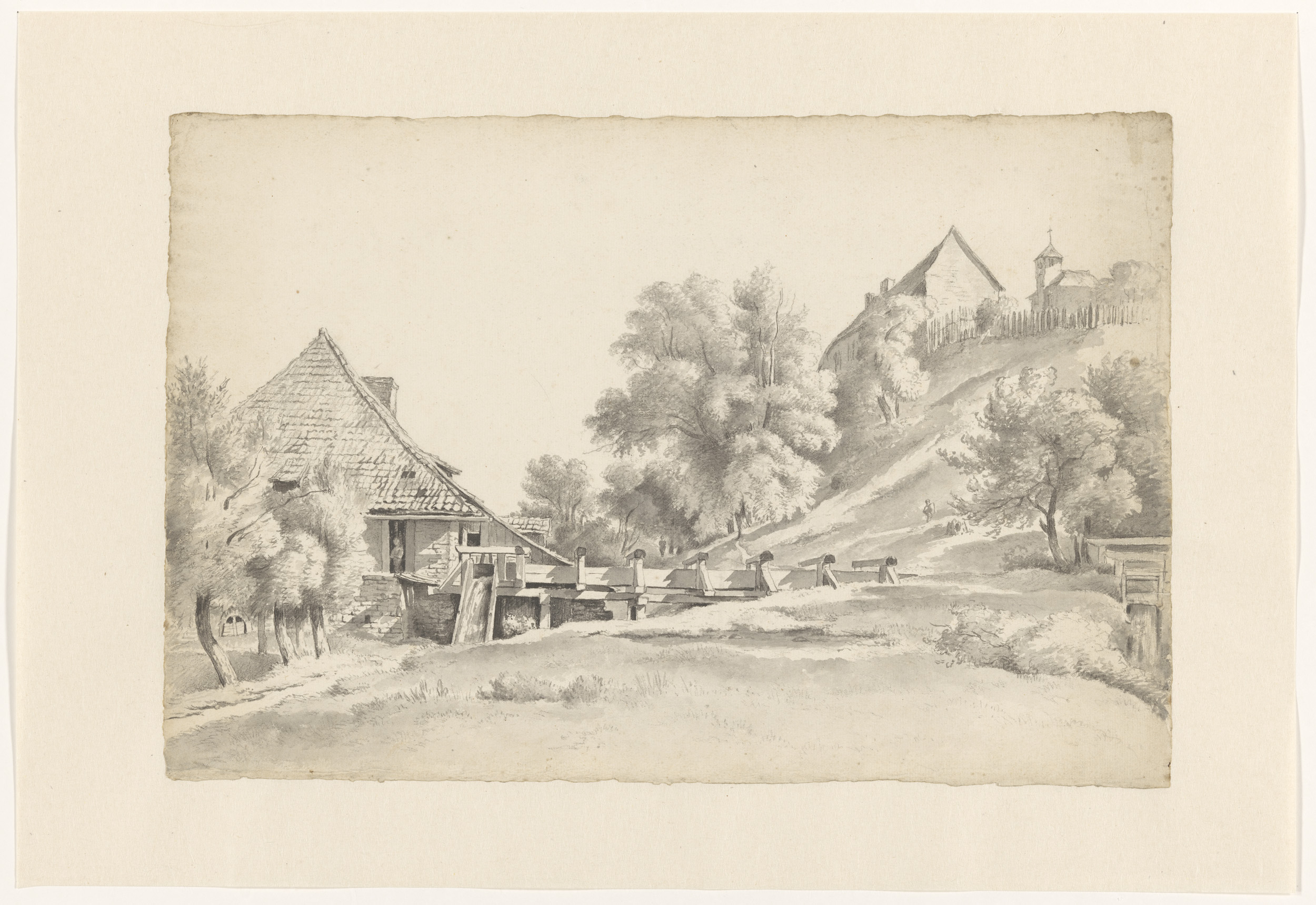 Landschap met een watermolen en een kerkje