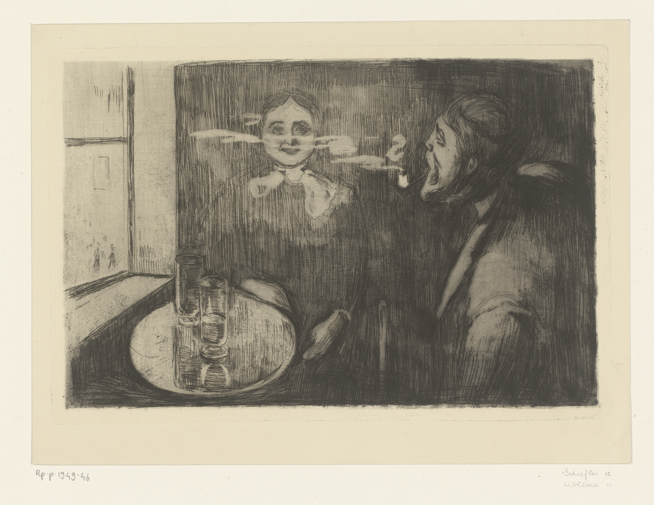 Vrouw en pijprokende man aan een tafel