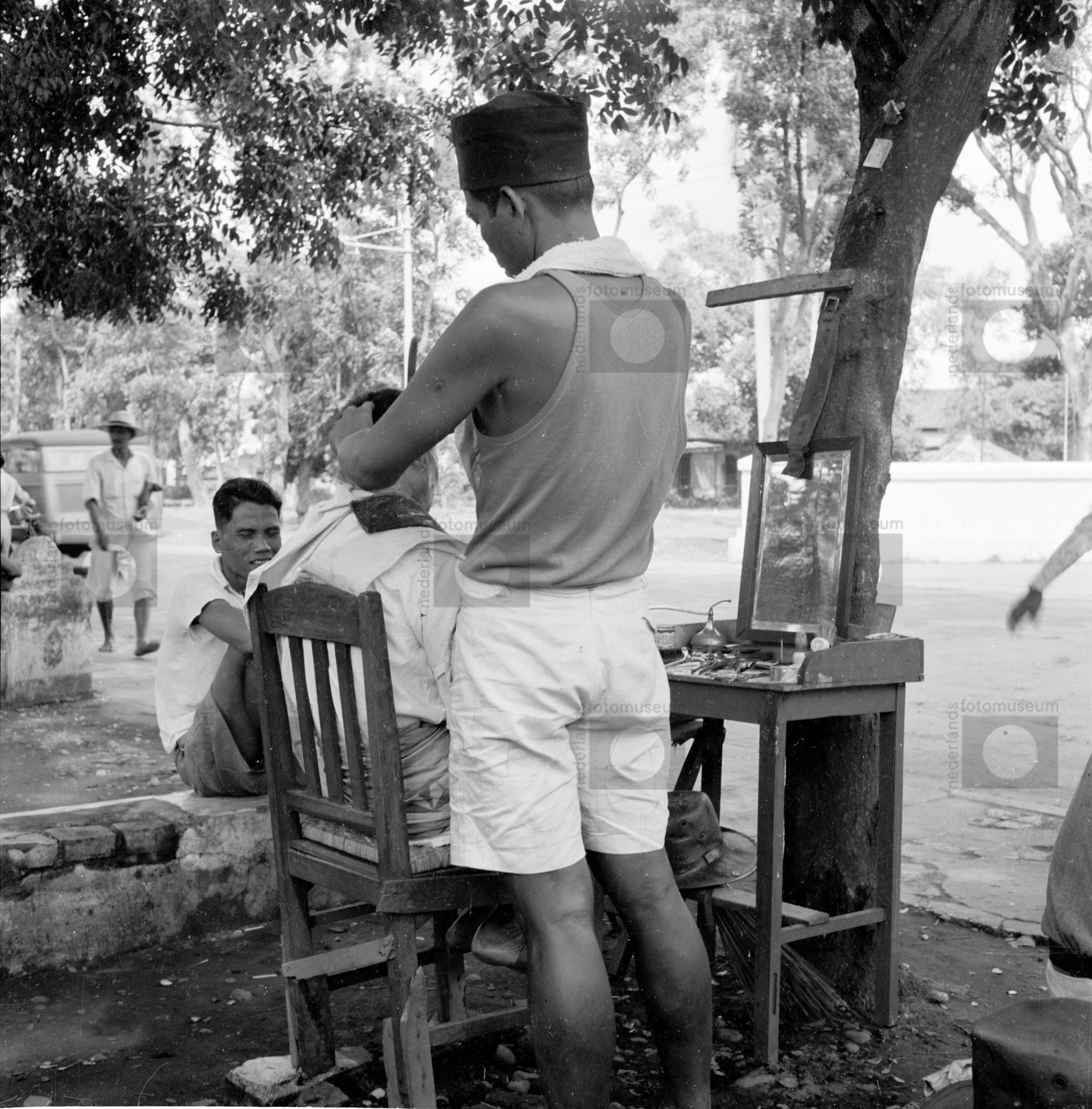 Een kapper knipt in de openlucht een klant, Indonesi...